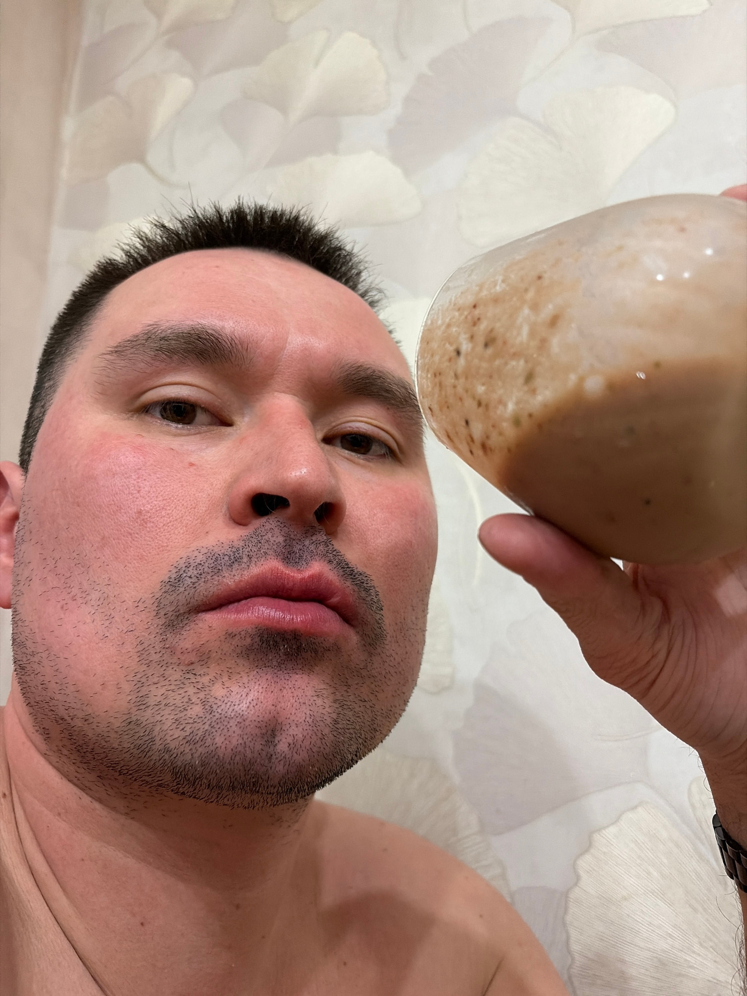 A man is holding a glass of liquid above his head. The liquid appears to be a smoothie or shake. He is looking up towards the glass with his mouth slightly open. His facial hair is dark and his comple…read more