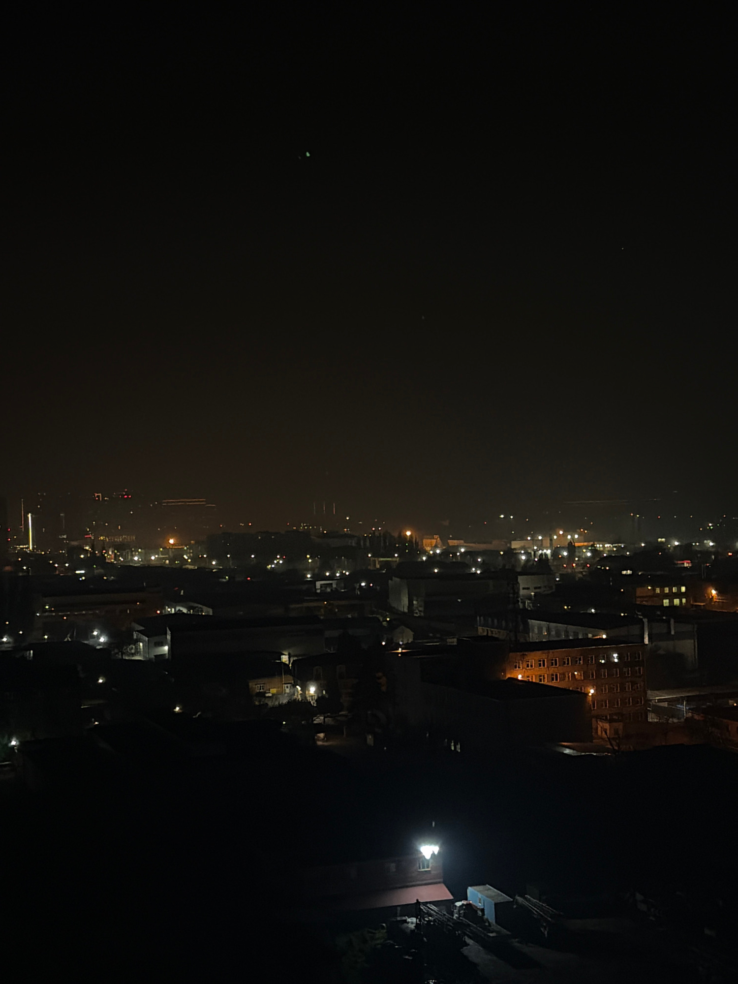 The image, when viewed in its intended landscape orientation (rotated 90 degrees clockwise from the provided original), captures a night-time cityscape or townscape from an elevated perspective. The…read more