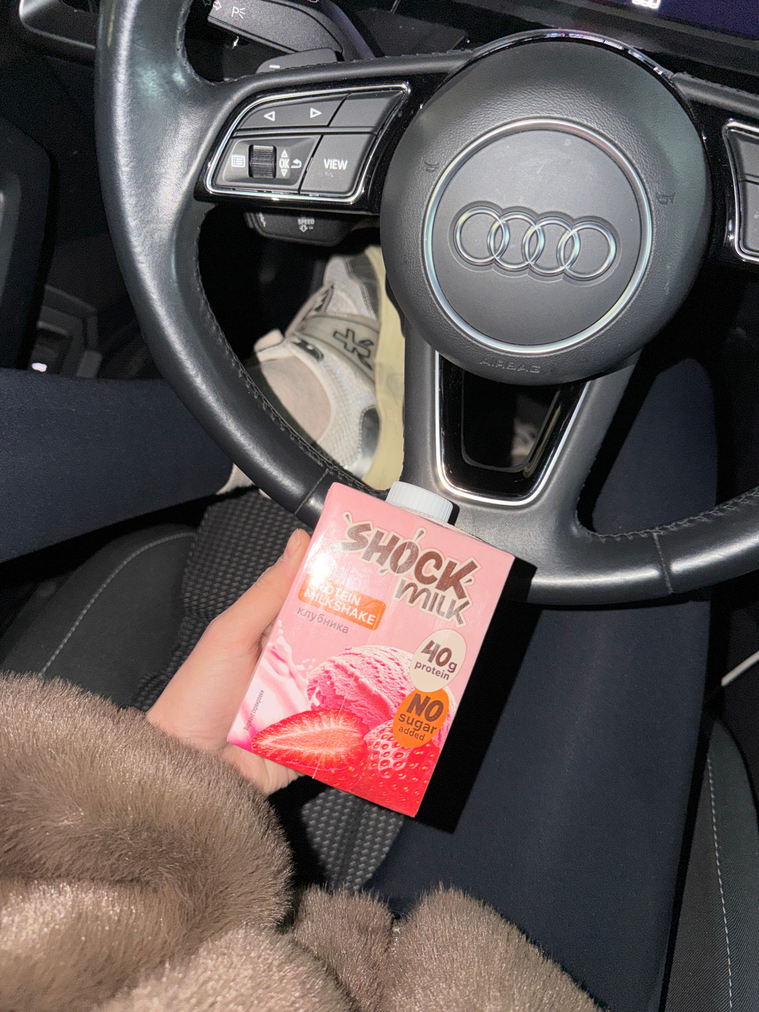 The image shows the interior of a car, focusing on the steering wheel. The steering wheel has an Audi logo at the center. A hand holds a pink carton of Shock Milk protein milkshake (strawberry flavor)…read more