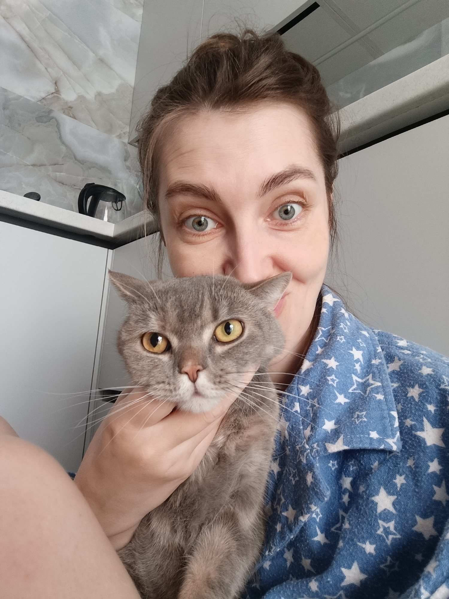 A selfie shows a woman indoors, holding a gray cat with yellow eyes. The woman has fair skin, light-colored eyes, and her brown hair is styled in a bun. She is wearing a blue star-patterned pajama topβ¦read more
