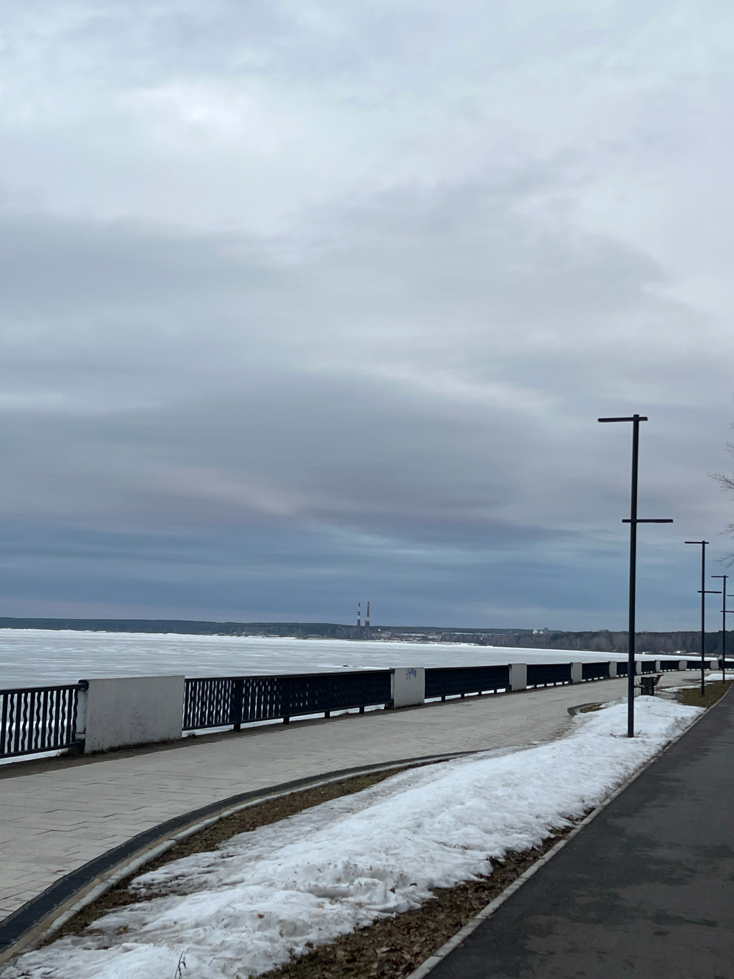 The image depicts a view of a frozen body of water, likely the Kama River, near the city of Chaikovsky, Russia. The scene is shot from a slightly elevated position along a paved embankment or promenad…read more