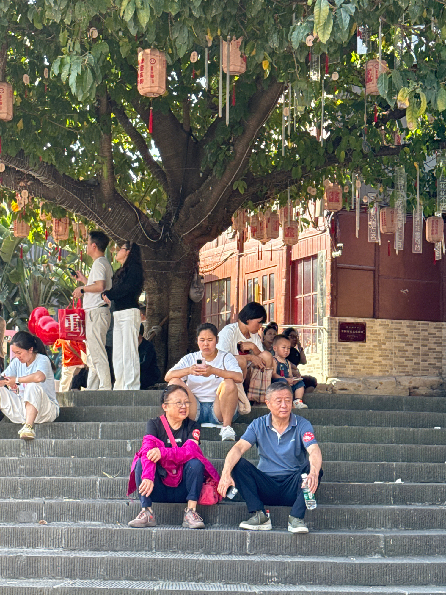 The image depicts a vibrant outdoor scene in Shapingba District, China, bustling with people under bright daylight. A large, verdant tree, covered in green leaves, occupies the left side of the frame.…read more