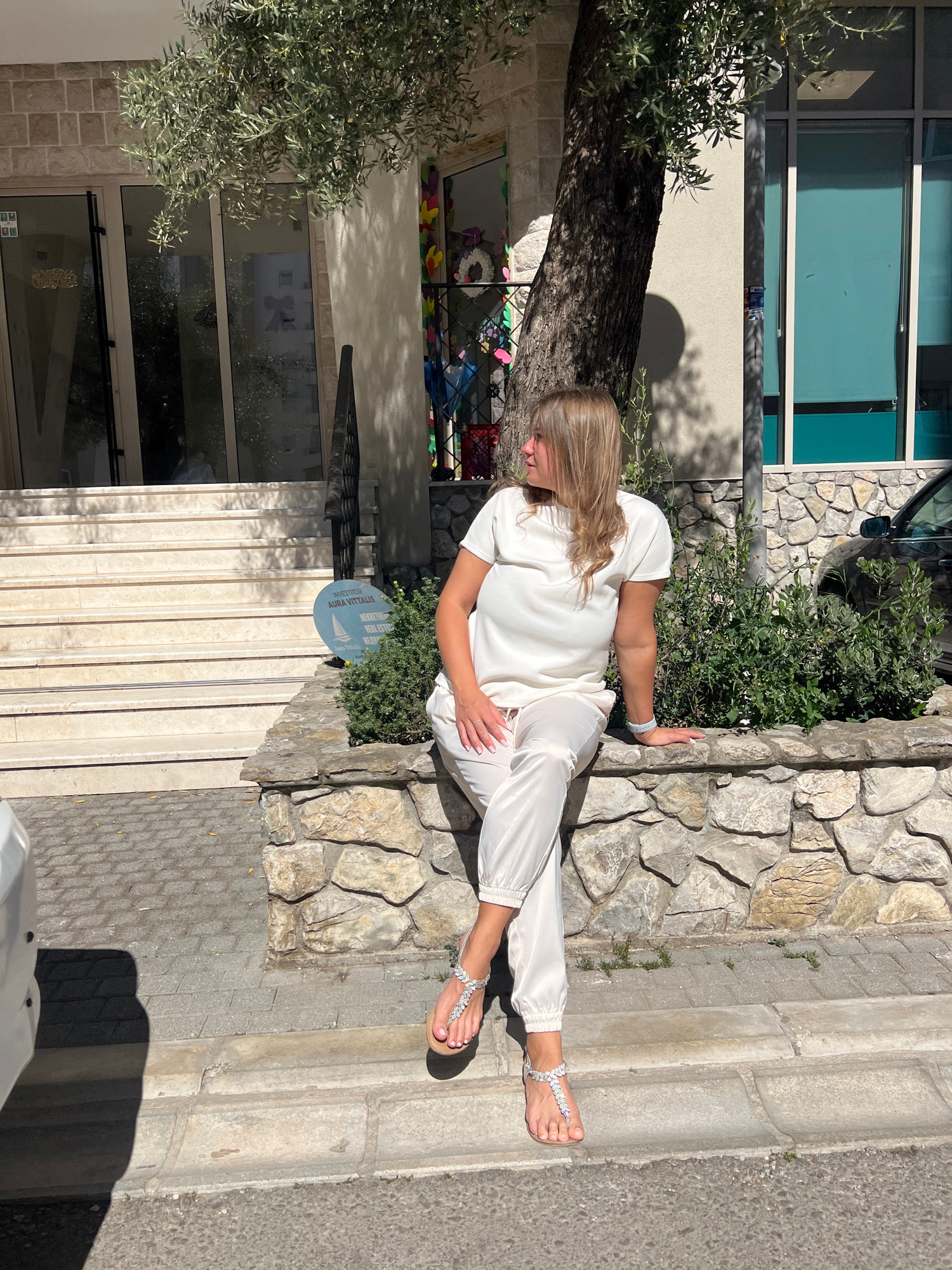 A woman wearing a white pajama set and sandals with sparkling embellishments is sitting on a ledge in front of a stone wall. She has blond hair and is wearing a wristband. The location appears to be iβ¦read more