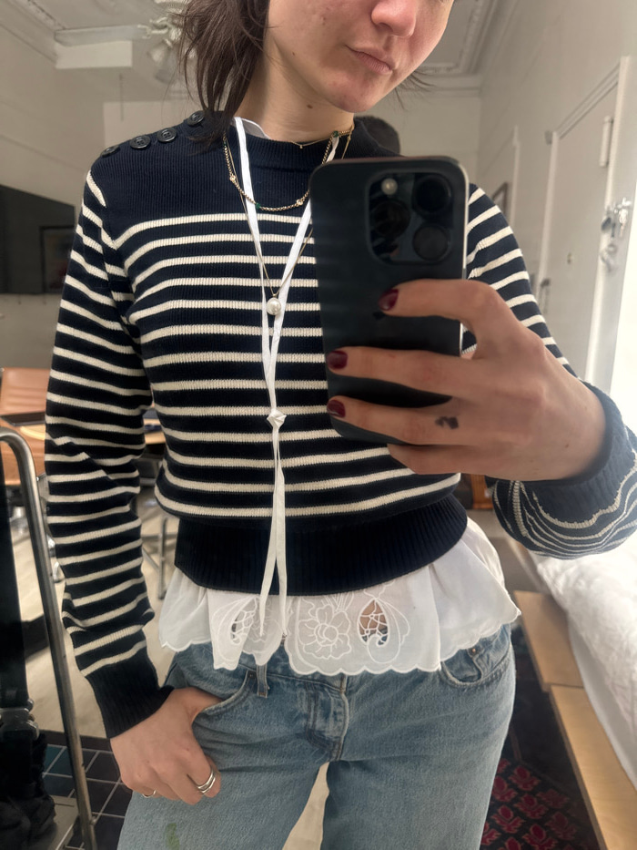 An individual, appearing to be a woman with dark brown hair, is captured in a mirror selfie indoors. She is wearing a navy blue and white horizontally striped long-sleeved sweater with three dark butt…read more