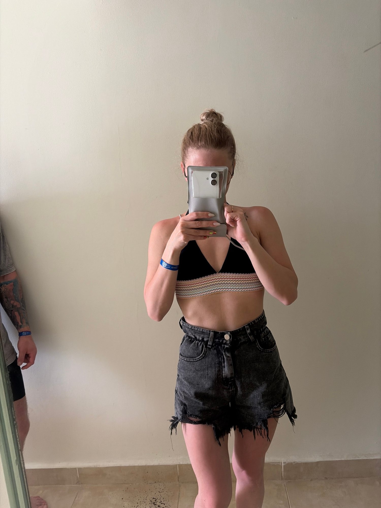 The image is a selfie of a young woman, possibly in her early twenties. She is wearing a black bralette with a multi-colored trim, and distressed dark-wash denim shorts. She is holding a white smartph…read more