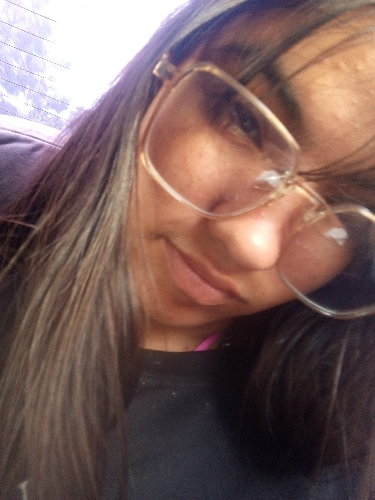 The image shows a person with long, dark hair with streaks of lighter color, wearing glasses with a light-colored frame. They are wearing a dark-colored top. The background appears to be a blurred win…read more