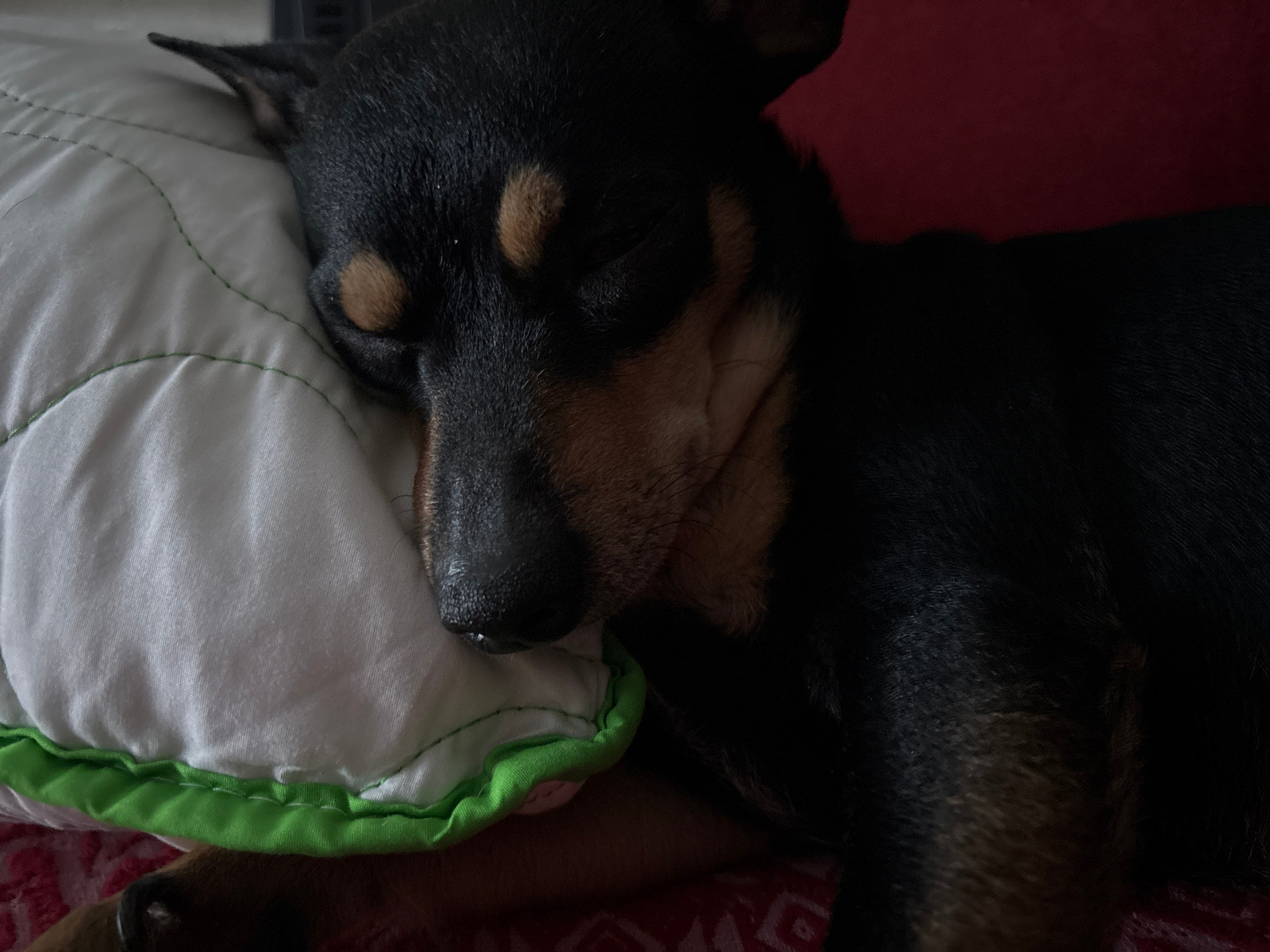 A close-up shot shows a black and tan Miniature Pinscher dog sleeping soundly on a white pillow with green trim. The dog's head rests on the pillow, with its eyes closed and its nose touching the fabr…read more