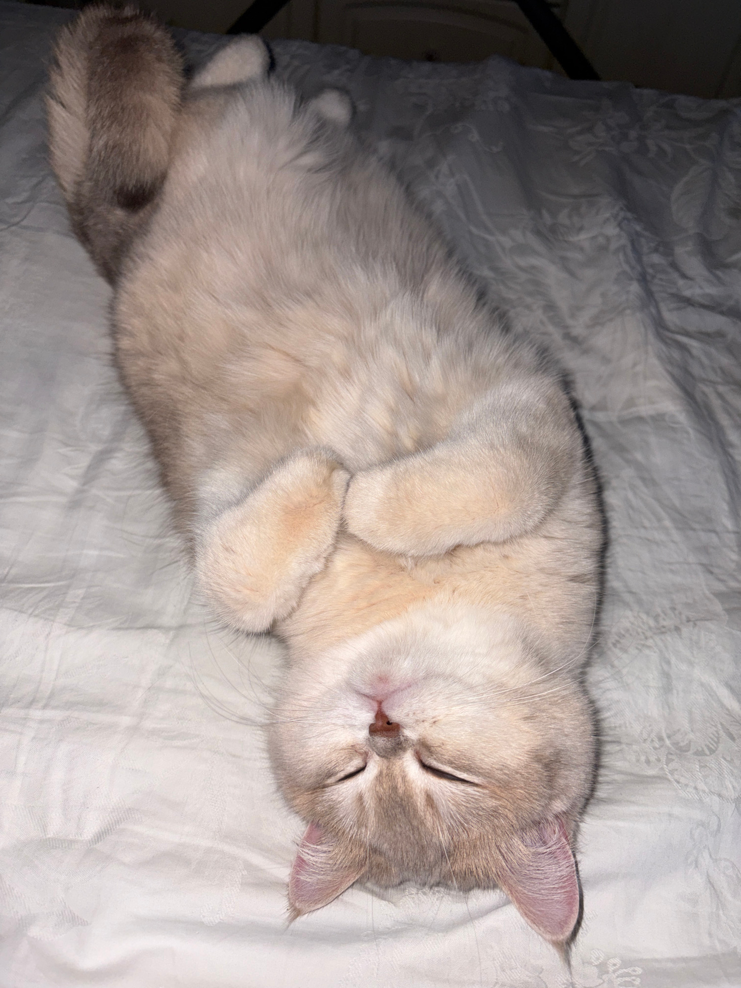 A silver-shaded British Shorthair cat is asleep on a white sheet. The cat is lying on its side with its paws curled up near its face. The cat's tail is also curled. The location is unspecified, and th…read more