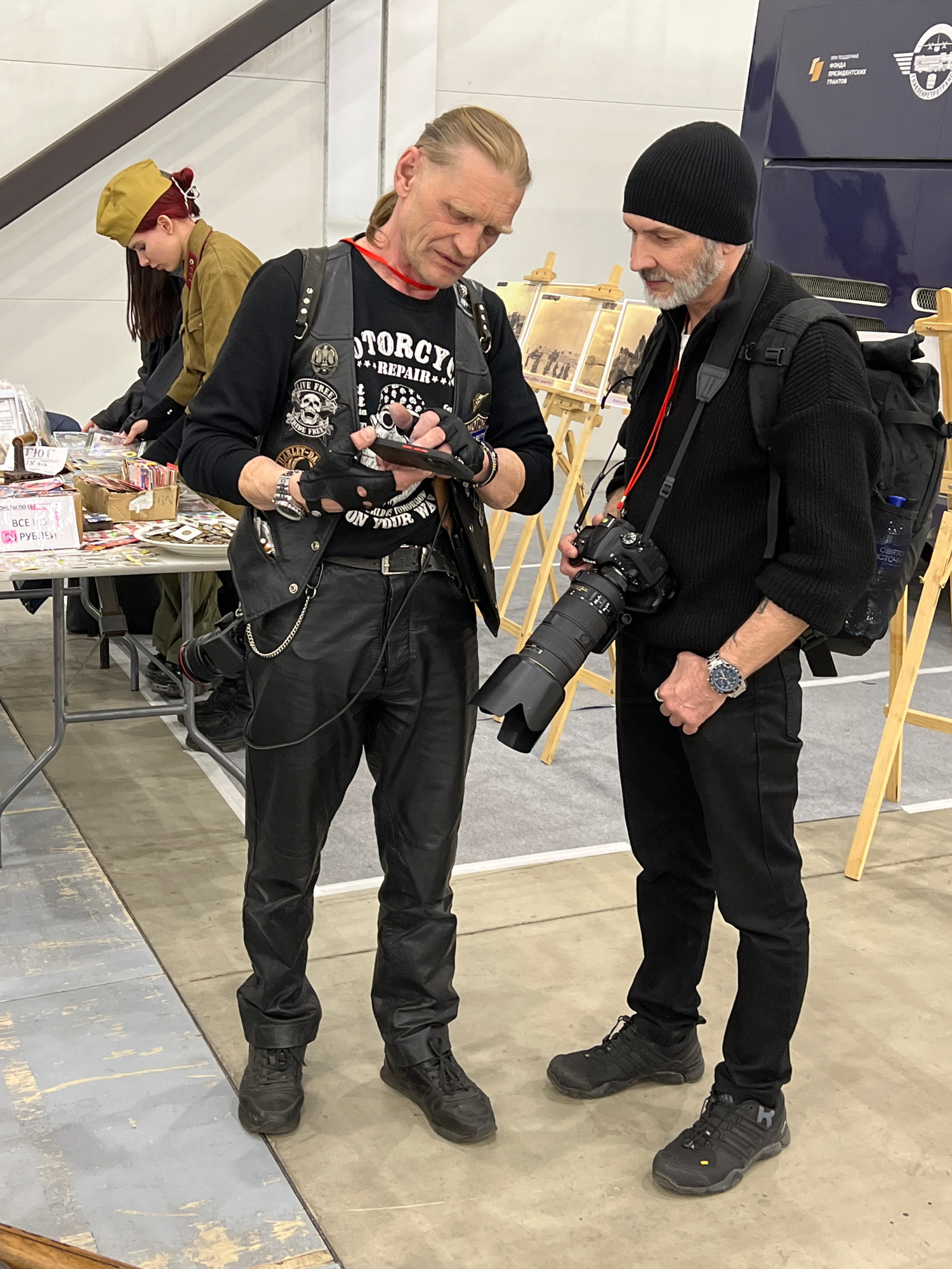 Here is a description of the image: The image captures two men standing at an exhibition or event. The man in the foreground is dressed in black leather pants, a black t-shirt with motorcycle-themedโ€ฆread more
