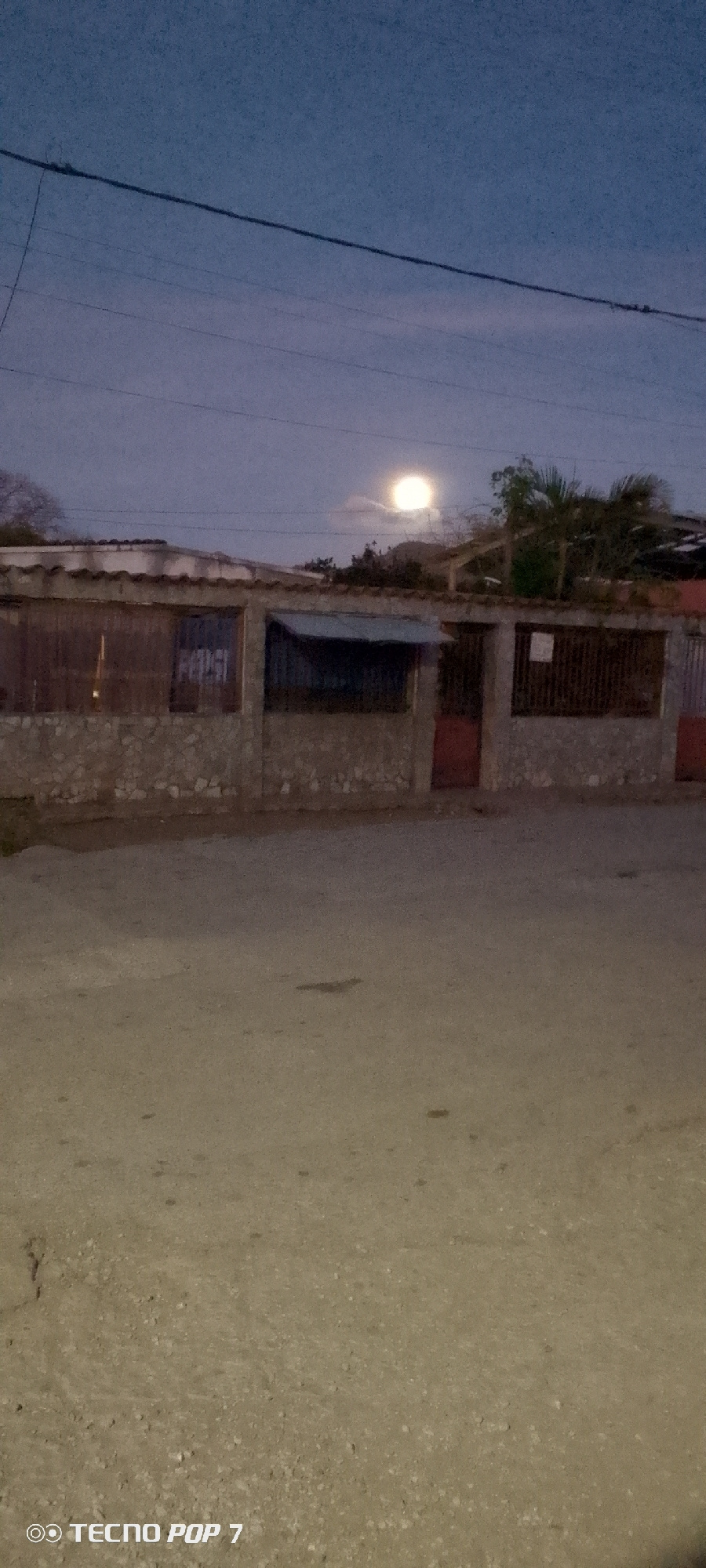 The image depicts a street scene in Altagracia, Venezuela at twilight or night. The sky is a deep blue, with the moon visible above a low-lying building. The building is a simple, one-story structure…read more