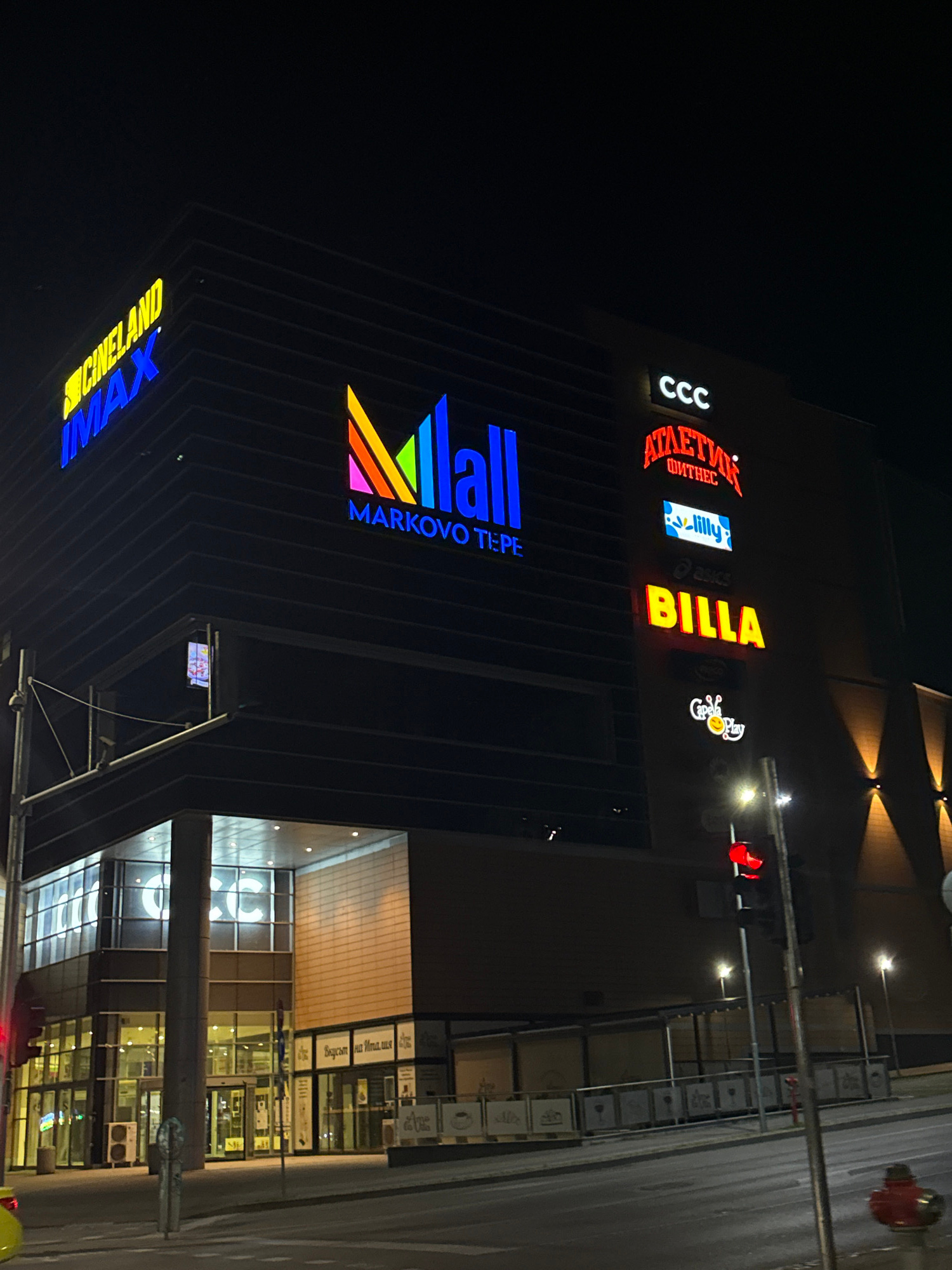 The image depicts the exterior of the Mall Markovo Tepe in Plovdiv, Bulgaria, at night. The mall's facade features several illuminated logos and brand names, including "CCC," "Атлетик Фитнес" (Athleti…read more