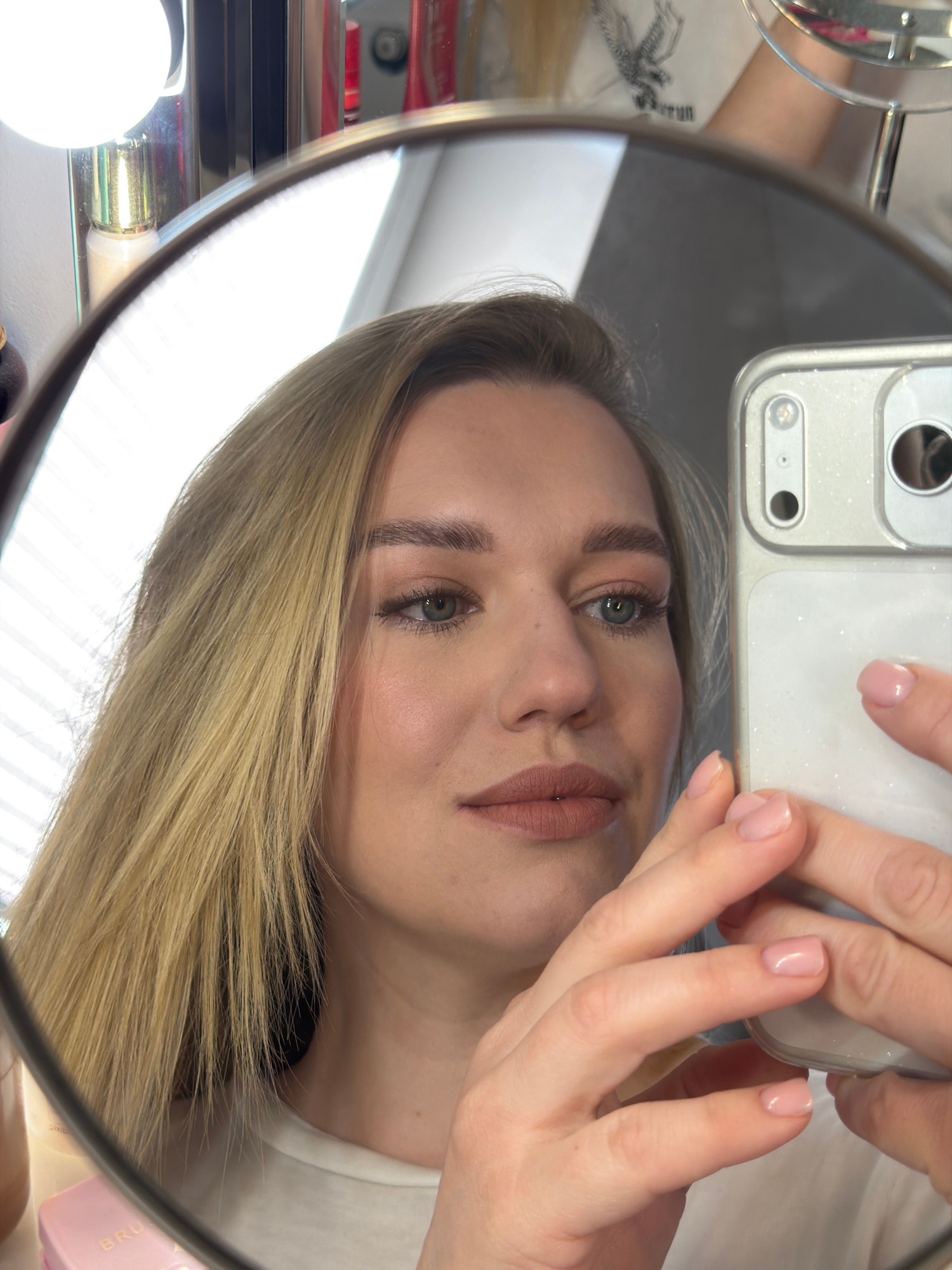 A person with light blonde hair and fair skin is reflected in a round vanity mirror. They are holding a silver smartphone with a white glitter case in front of their face, suggesting they are taking a…read more