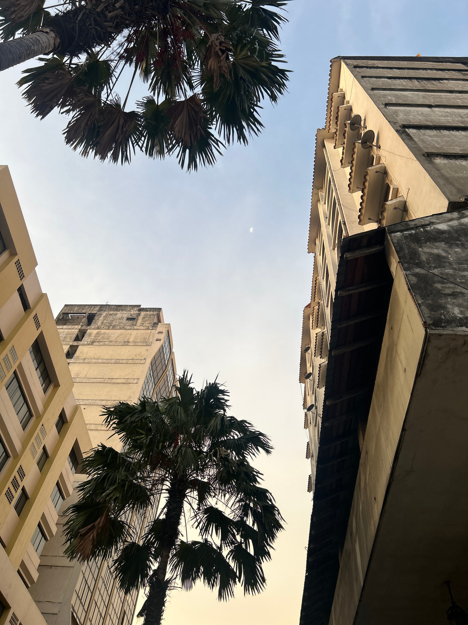 A low-angle view of a cluster of buildings and palm trees against a pale blue sky. In the upper portion of the frame, a large, imposing building structure with a concrete and textured facade juts in…read more