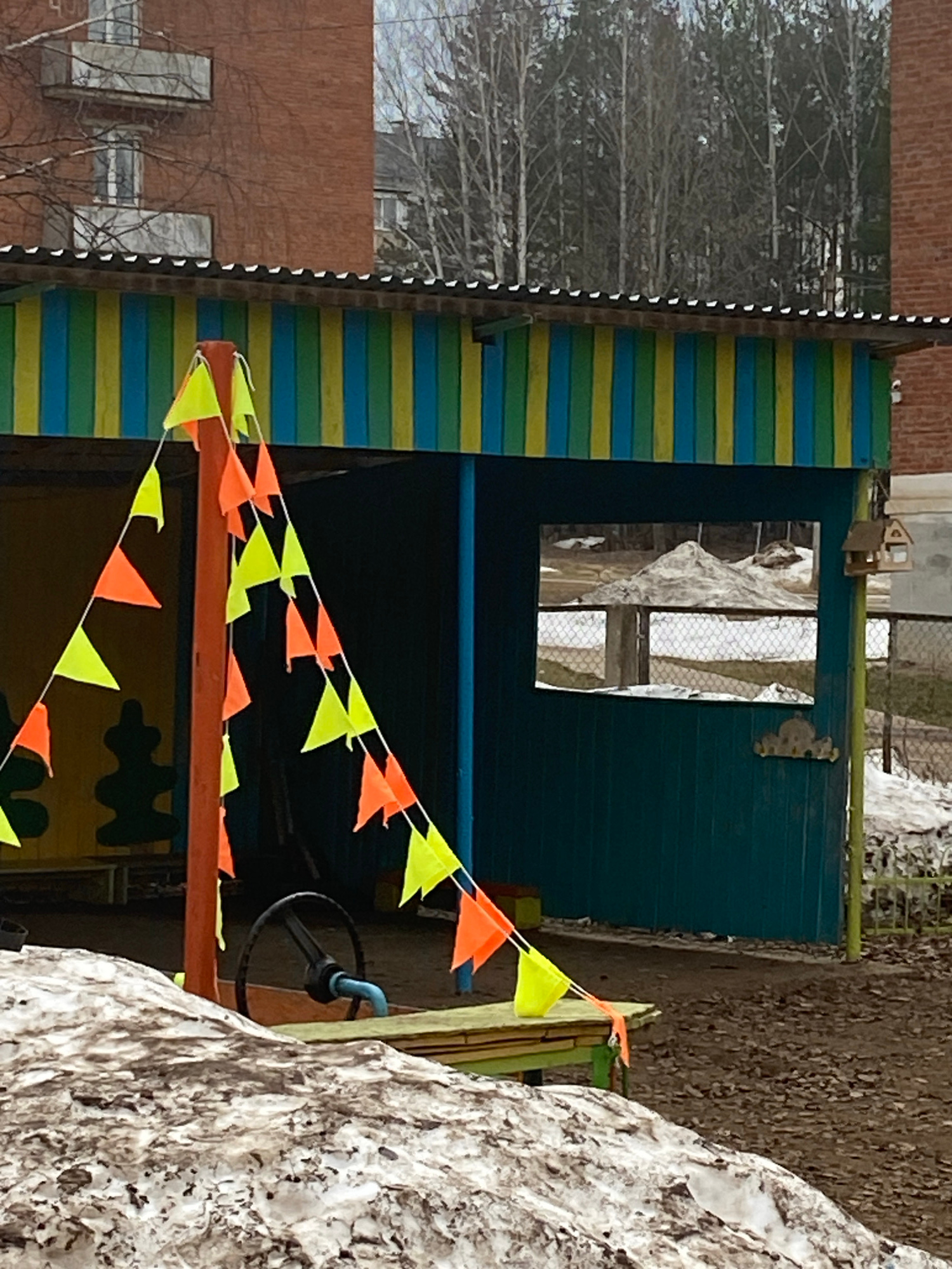 The image depicts an outdoor scene, likely a playground or recreational area, located in Noviy, Russia. A structure painted with horizontal blue and yellow stripes stands adjacent to a brick building.…read more