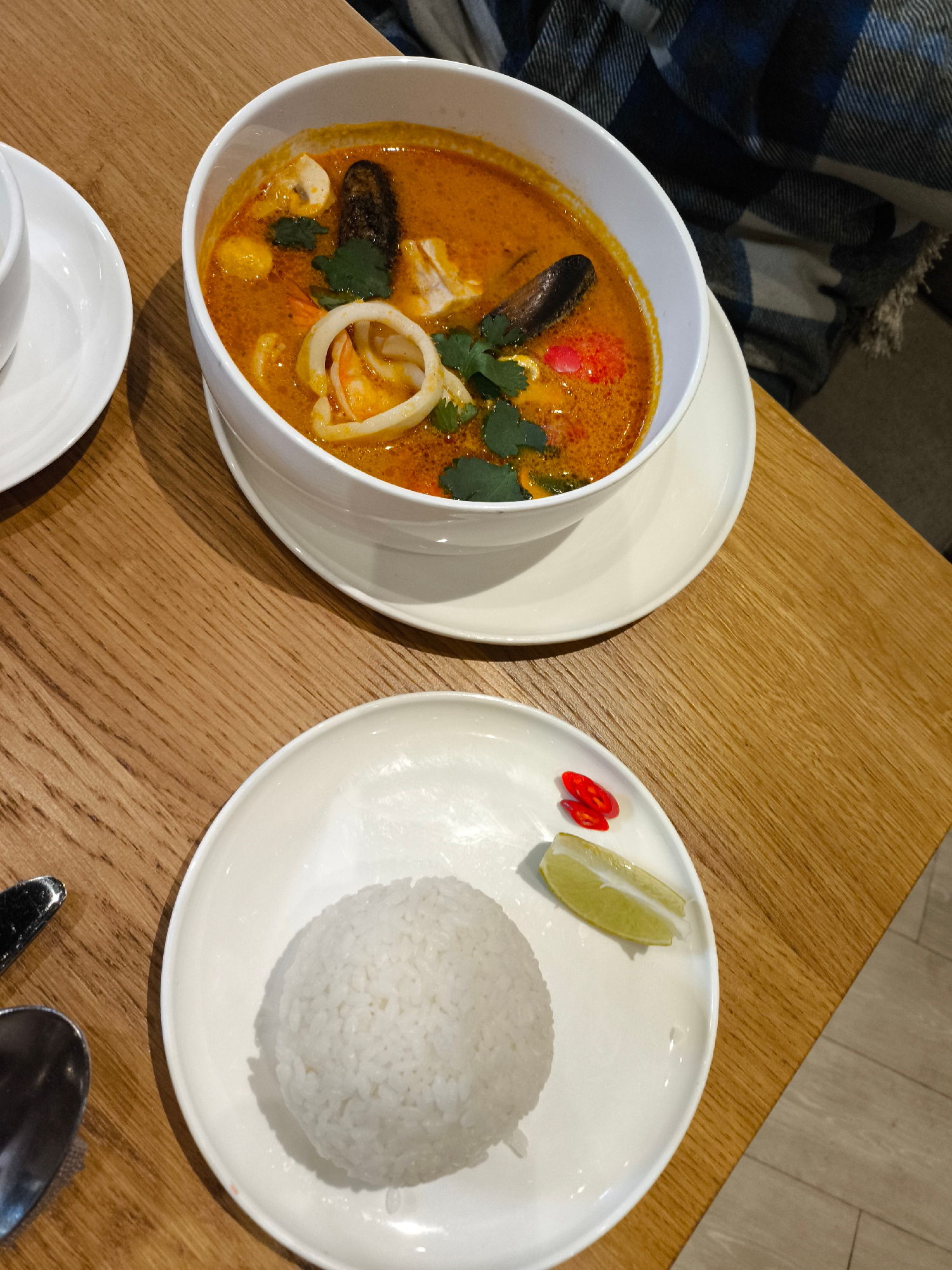 A top-down shot shows a wooden table in a restaurant in Khimki, Russia. At the top of the frame is a white bowl filled with soup, likely tom yum, containing seafood like mussels and squid. Fresh cilanβ¦read more