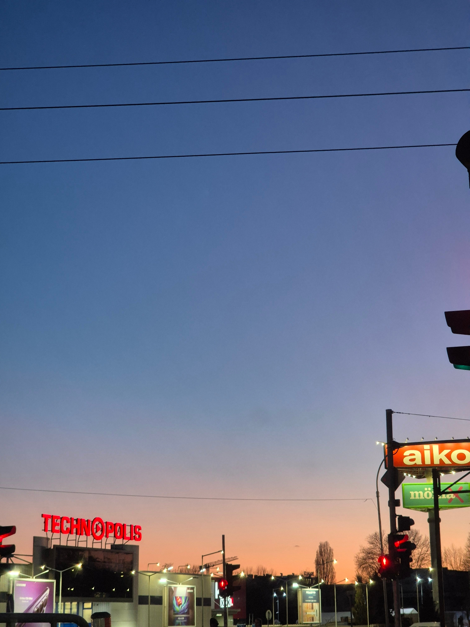 The image depicts a street scene in Varna, Bulgaria at dusk. The sky transitions from blue to orange. Visible on the right side is the "TECHNOPOLIS" store with a bright red sign. Further up the stree…read more