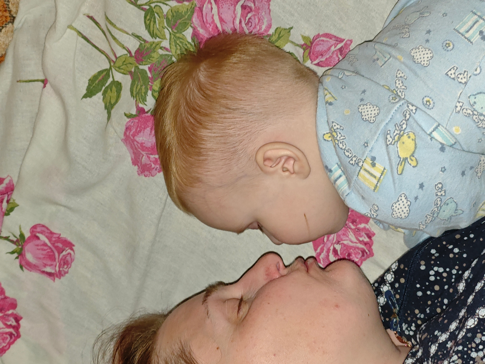 A woman and a baby are lying on a floral-patterned surface. The baby, wearing a blue patterned onesie, is positioned above the woman, with their faces close together. The woman has her eyes closed, wh…read more