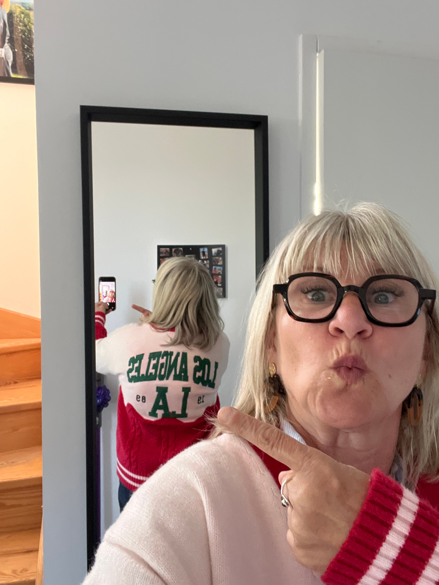 A woman with blonde hair and glasses is taking a selfie in a mirror. She is wearing a red and white striped sweater over a white shirt, and her finger is pointing towards her shoulder. The reflection…read more