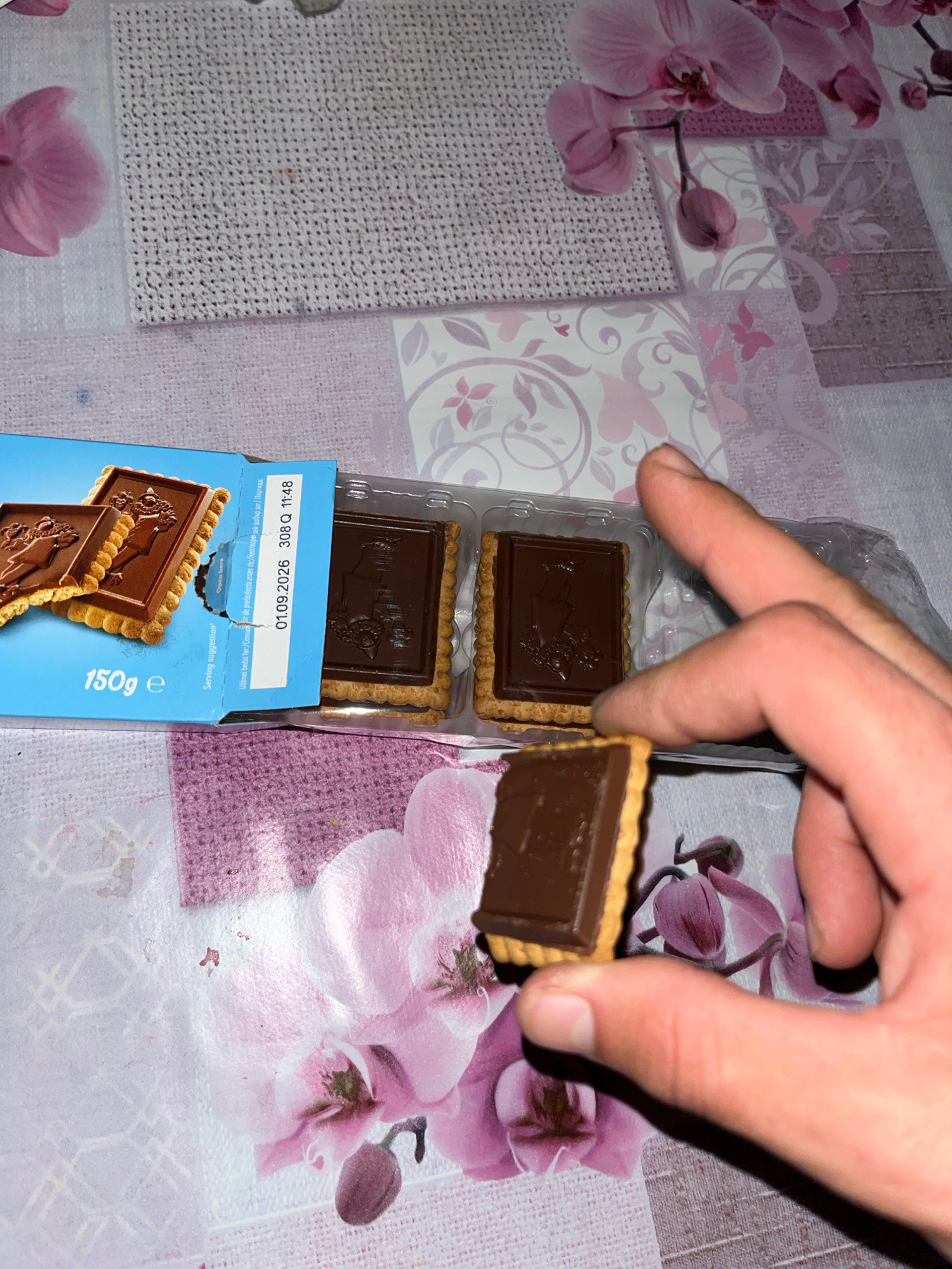 The image displays an indoor scene focused on a person's hand interacting with a package of chocolate biscuits. The setting is a table or surface covered by a patterned tablecloth featuring purple and…read more