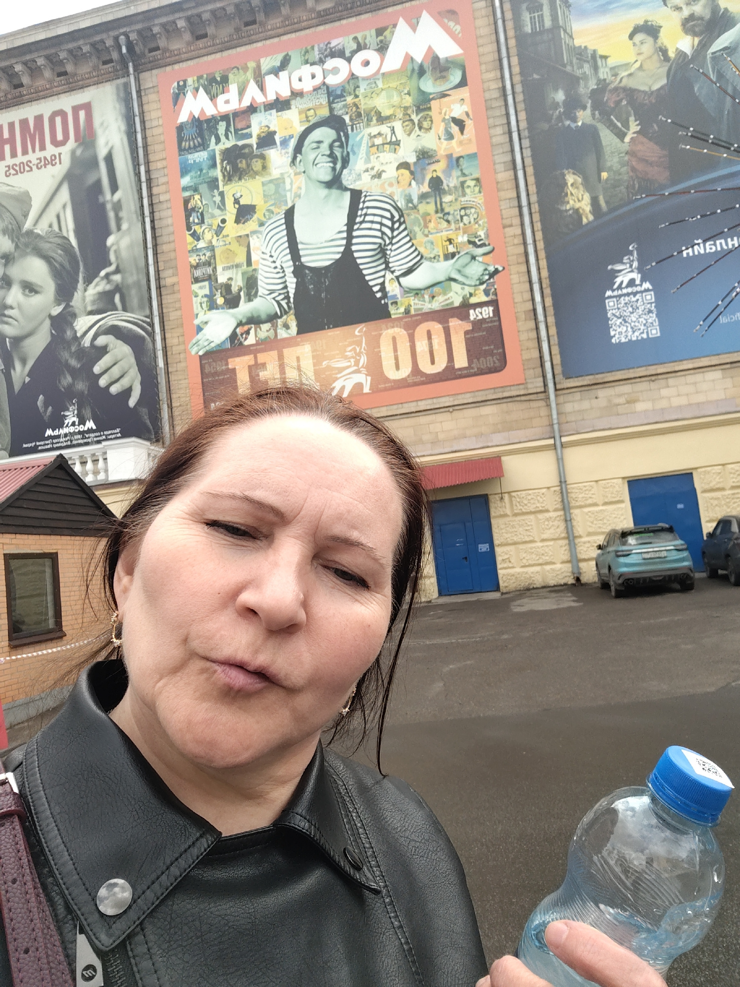 A woman takes a selfie in an outdoor setting, holding a clear plastic water bottle with a blue cap. She has dark hair, is wearing a black leather jacket with a silver-colored snap, and gold-colored ea…read more