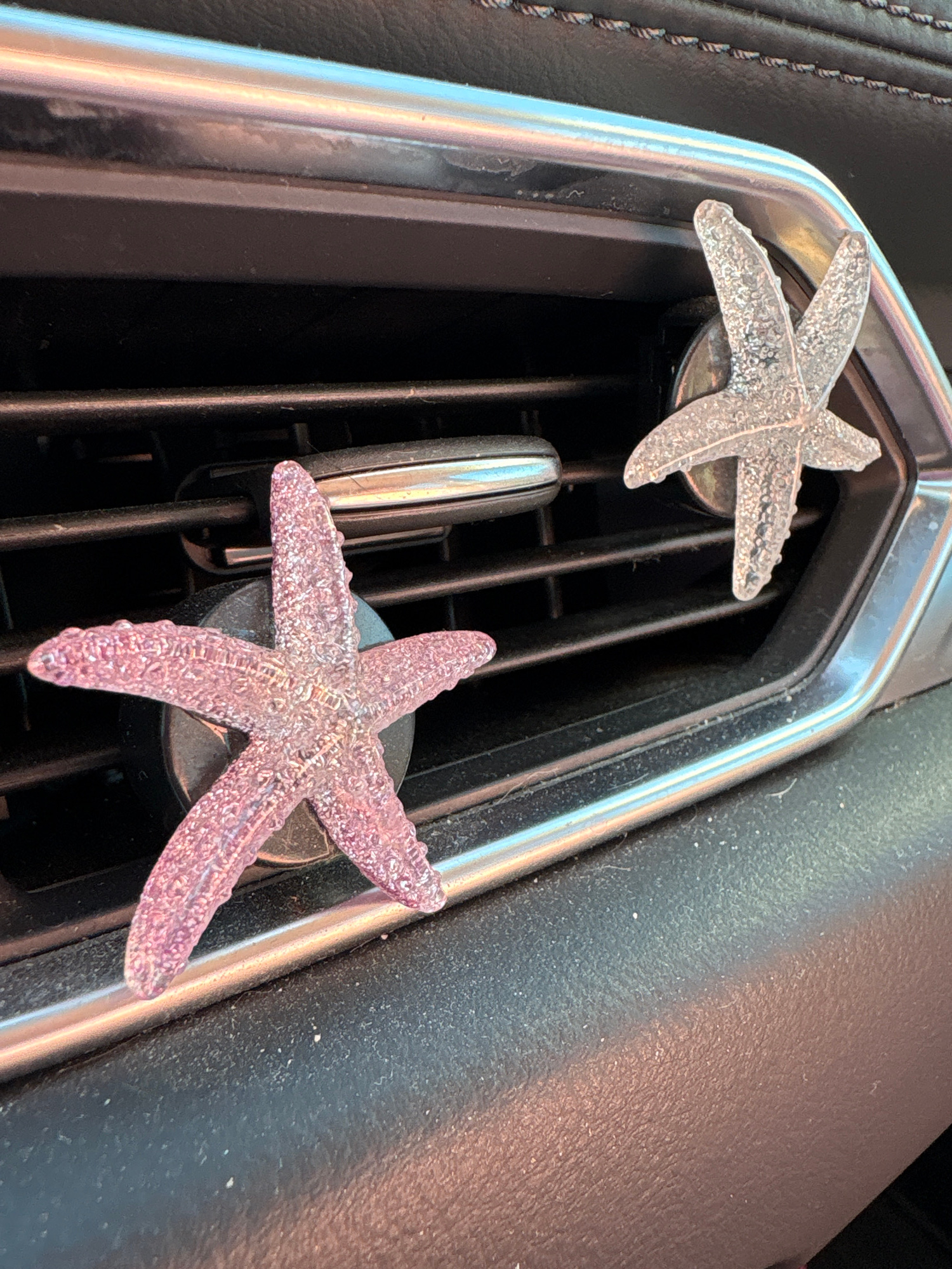 The image shows the dashboard air vent of a car. Two decorative starfish are clipped to the vent. The upper starfish is translucent and colorless. The lower starfish is translucent and light pink. The…read more
