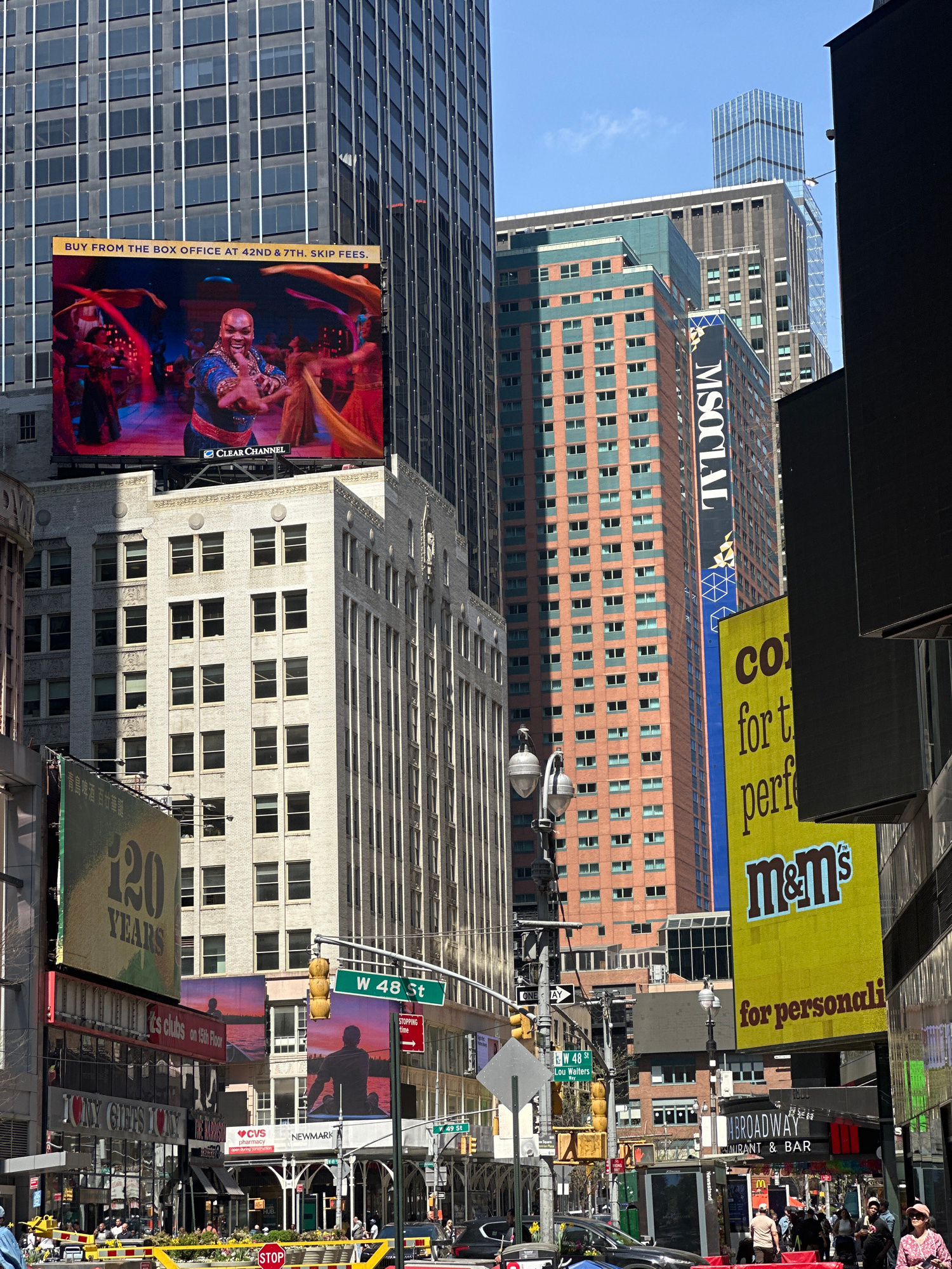 This photograph captures a bustling street scene in the heart of Times Square, New York City. Dominating the view are towering buildings adorned with numerous advertisements and billboards. Among the…read more
