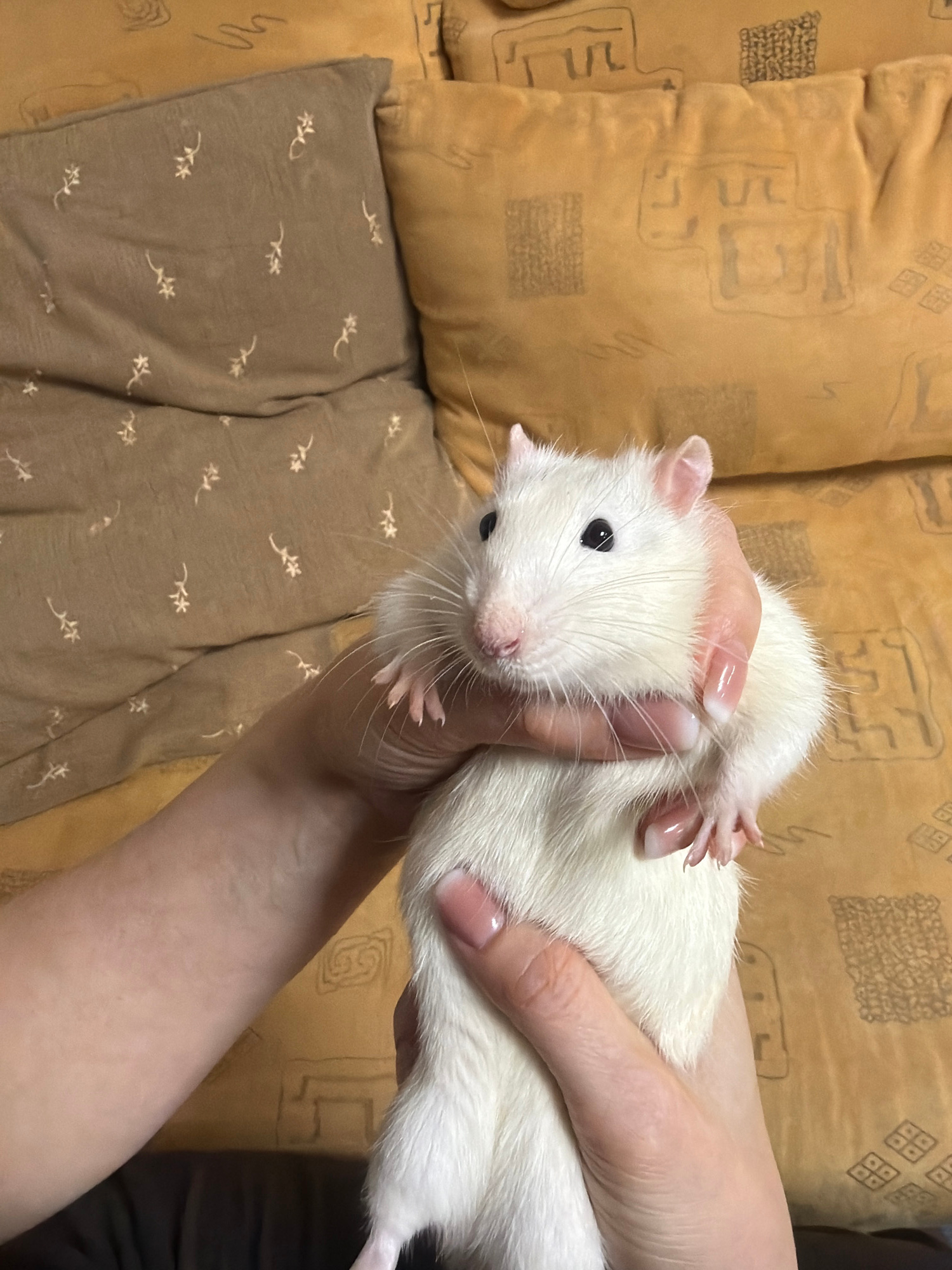 A white rat is held in a person's hand indoors. The rat is facing the camera with its black eyes and pink nose visible. The person's hand is holding the rat's body, with manicured nails visible. The b…read more