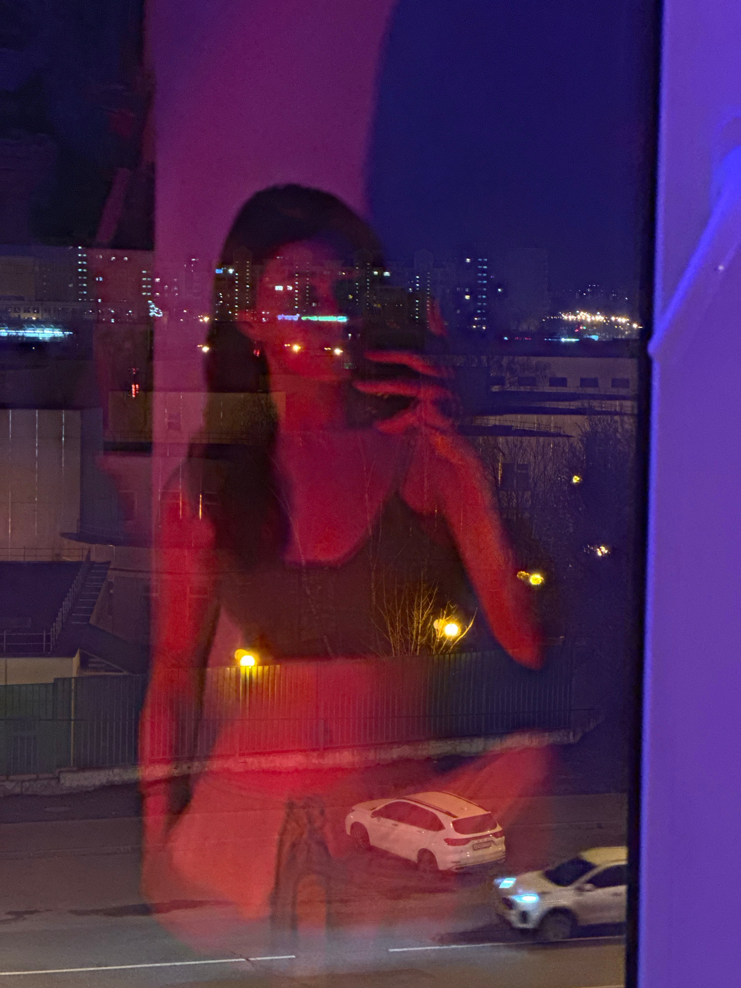 The image appears to show a woman sitting near a window at night. The window reflects the city lights of Moscow, Russia, as well as images of buildings and streetlights. A car is visible outside. The…read more
