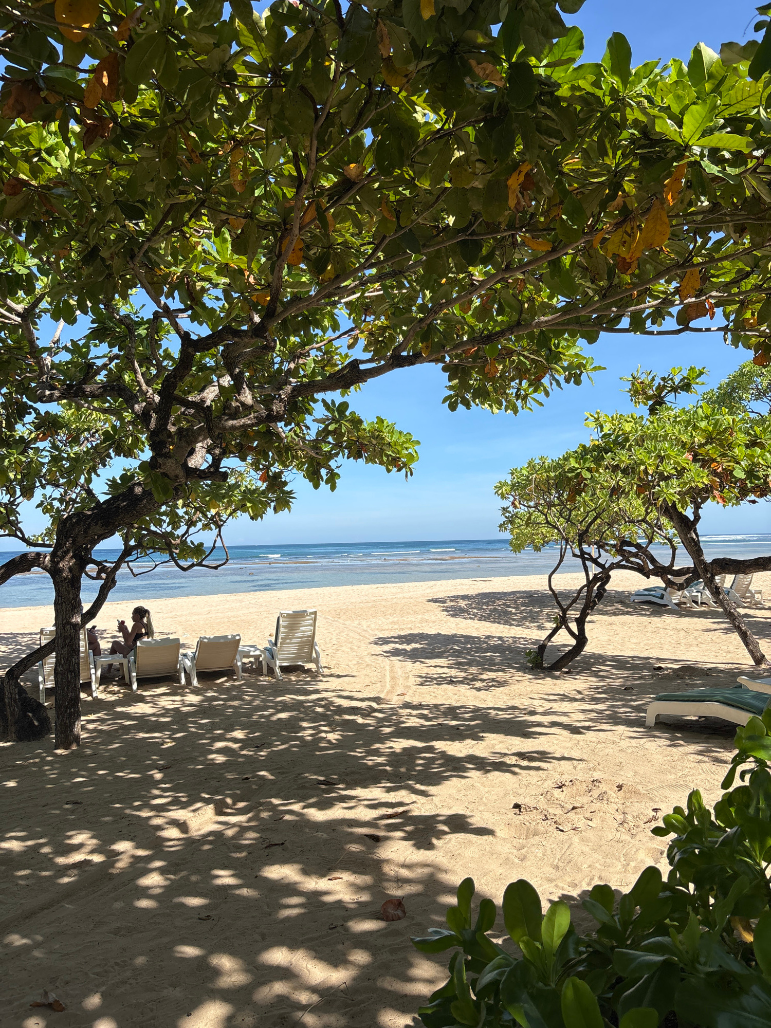 The image shows a beach scene in Kuta Selatan, Indonesia. The view is partially framed by trees on both sides. The beach is sandy with scattered lounge chairs, some of which are occupied by people. Th…read more