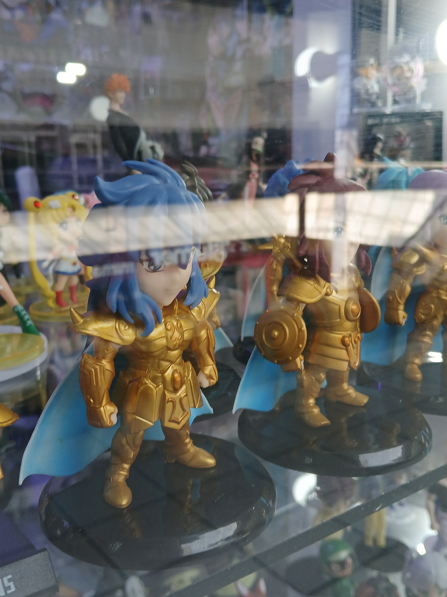 In a display case, presumably in a retail setting in Ciudad Guayana, Venezuela, three anime-style figurines are arranged vertically. The figurines appear to be gold-colored characters in armor with fl…read more