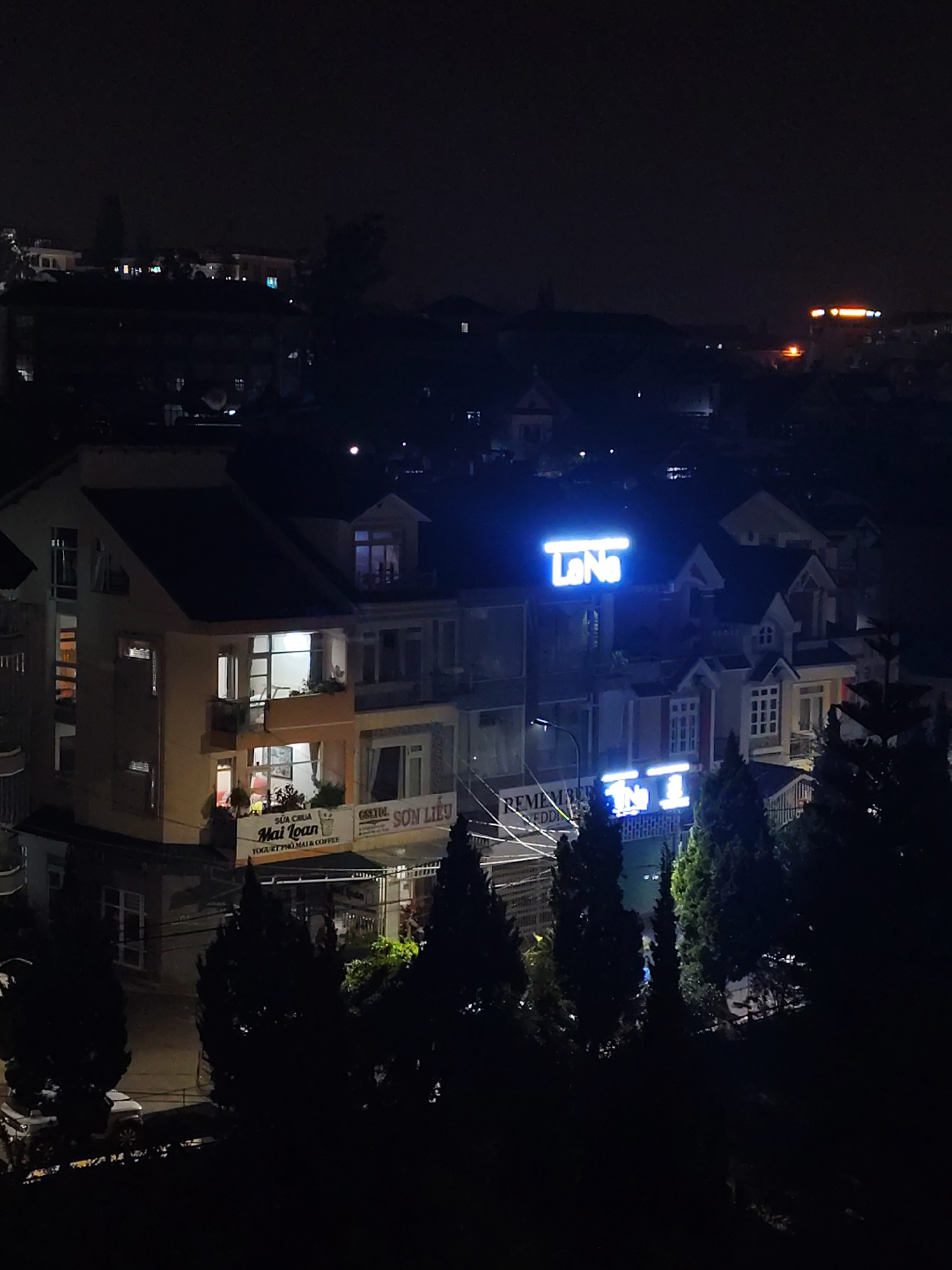 The image shows an elevated nighttime view in Da Lat, Vietnam. A building illuminated with a blue neon sign reading "La Na" is a central point, with other structures and residences visible in the back…read more