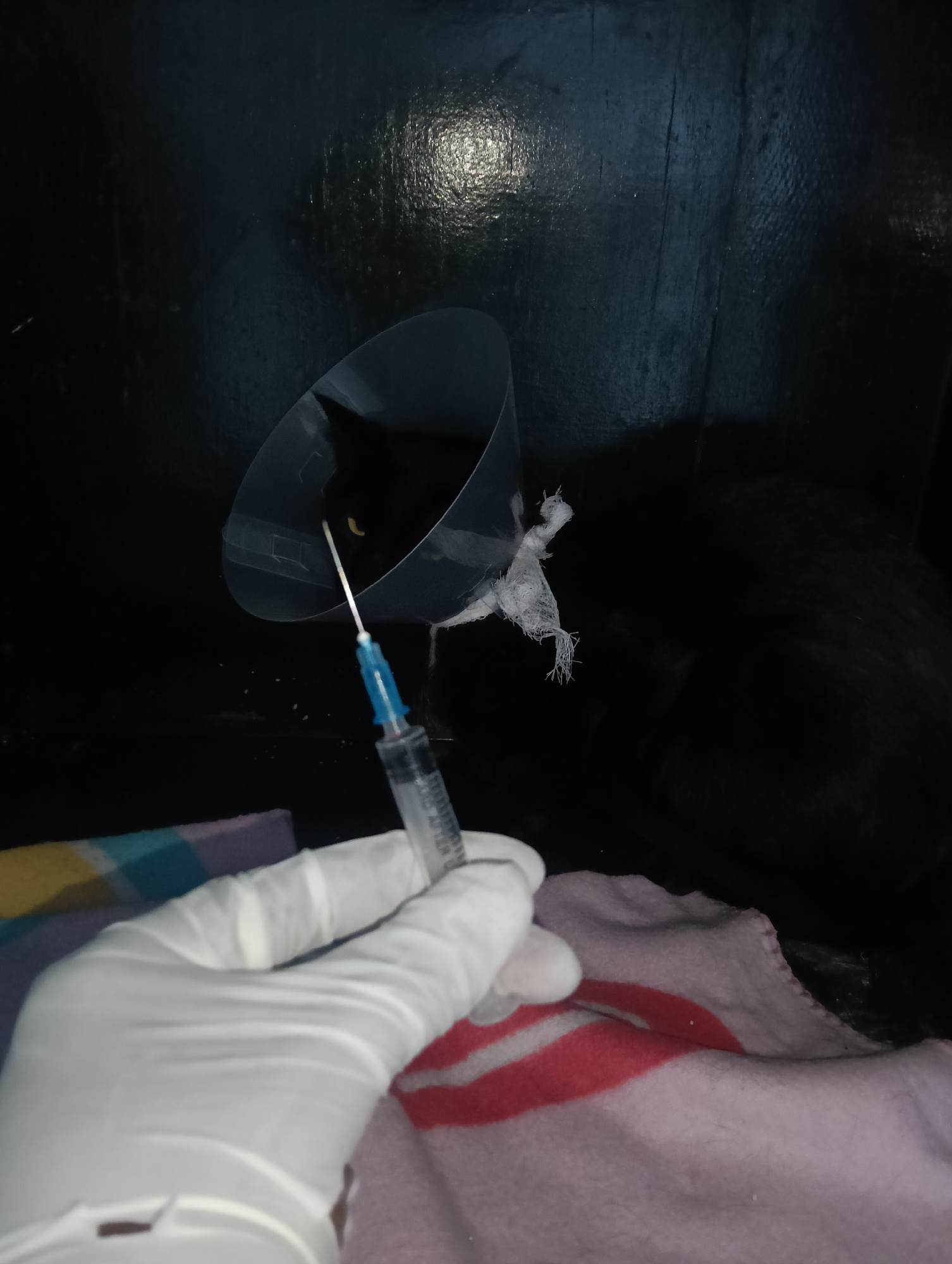 A dark, indoor space features a black cat wearing a clear plastic cone of shame. A gloved hand holds a syringe towards the cat. The cat's fur is mostly black, with one visible yellow eye. The cone is…read more