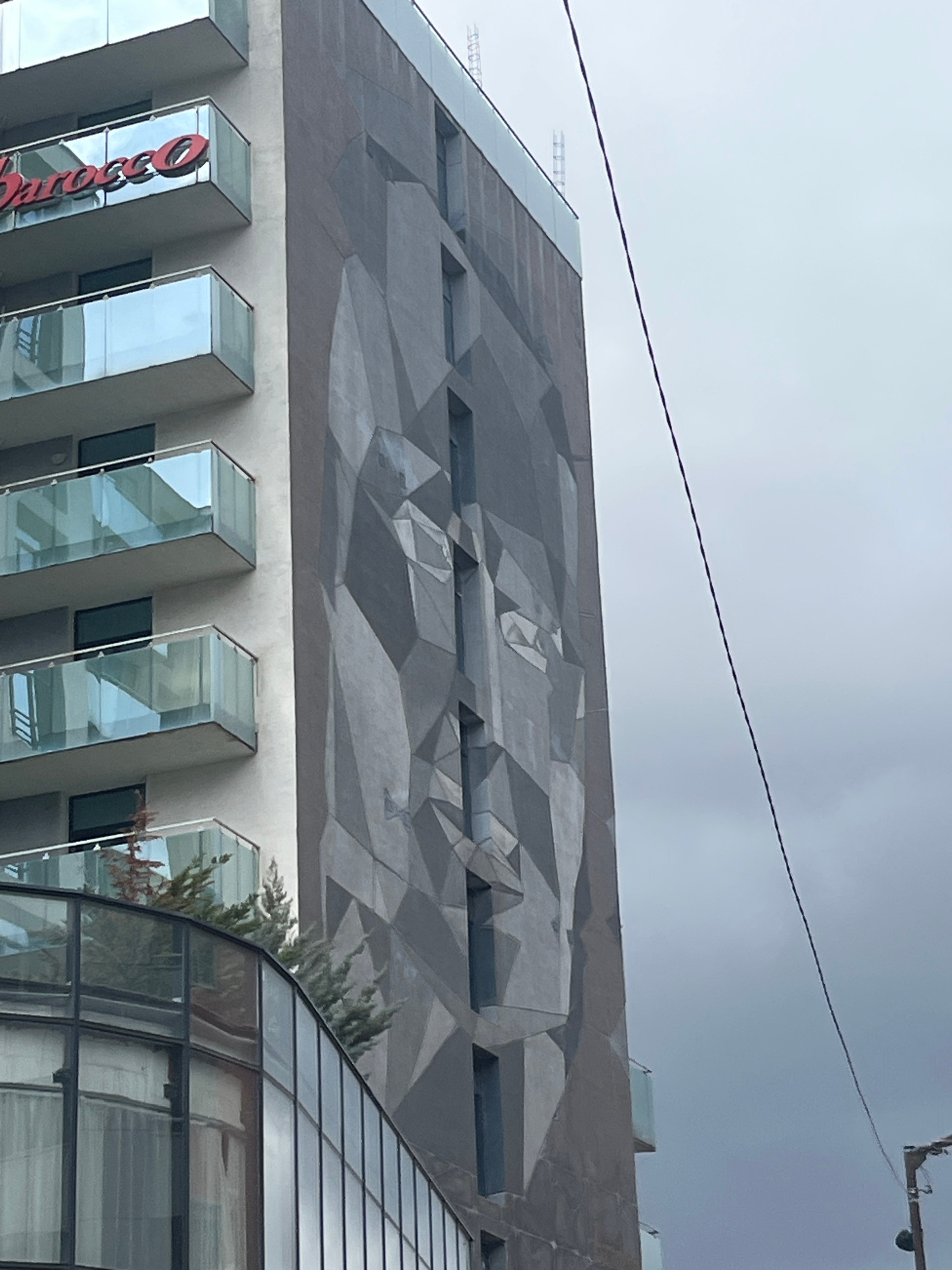 The image shows a section of a modern building in Sofia, Bulgaria, with a distinctive geometric mural on the upper portion of the facade. Below the mural, the building features a series of vertical gl…read more