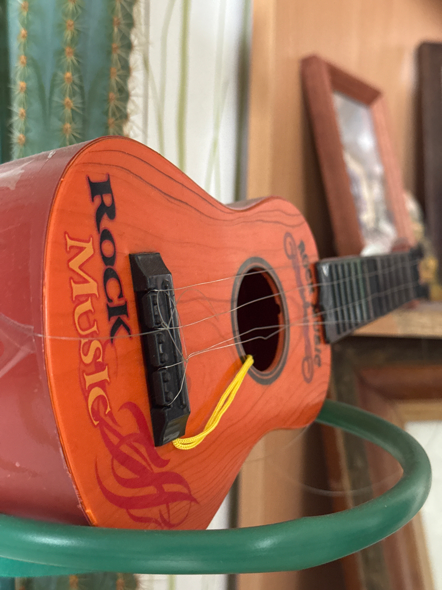 The image features a close-up, shallow depth of field shot of an orange toy guitar with "Rock Music" written on its body. The word "ROCK" is in black capital letters, and "Music" is in a gold-orange c…read more