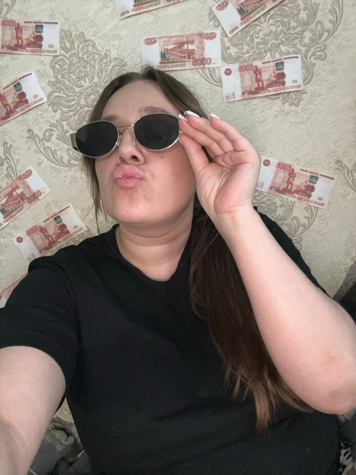 A woman in a black top and sunglasses lies on a patterned surface surrounded by multiple 5000 banknotes. The location is not specified as Chaikovsky, Russia, in the image and cannot be verified.