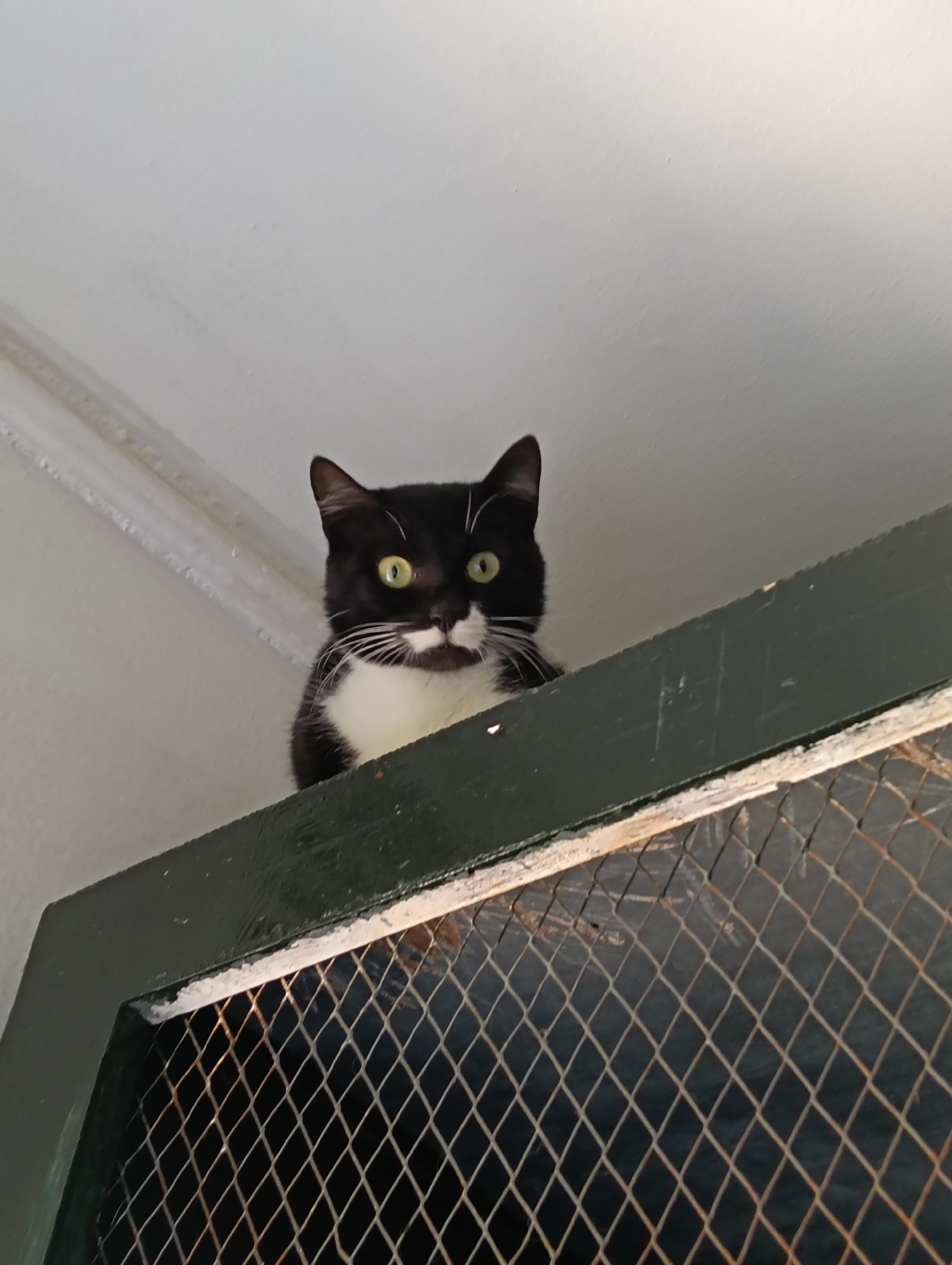 A medium shot depicts a black and white tuxedo cat perched atop a dark green, wire-mesh door or cabinet. The cat's eyes are green and it stares directly at the camera. The background consists of a whi…read more