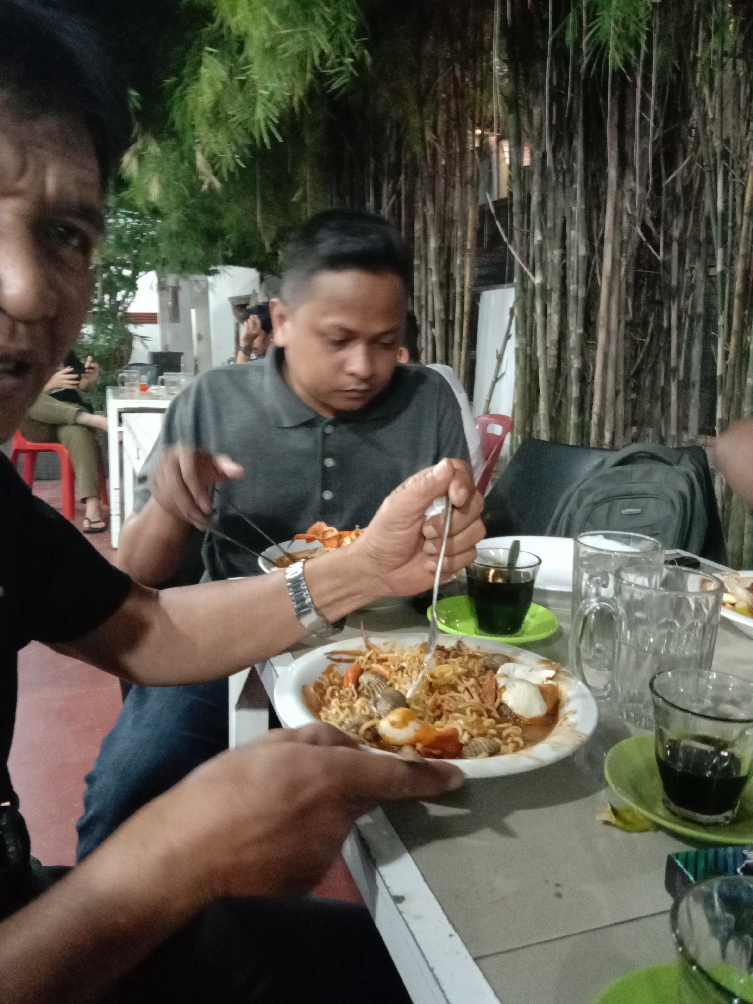 Three men sit at a table outside a restaurant in Lhokseumawe, Indonesia. One man wears a black t-shirt and a silver watch. Another man is seated next to him and is wearing a grey polo shirt. Both men…read more