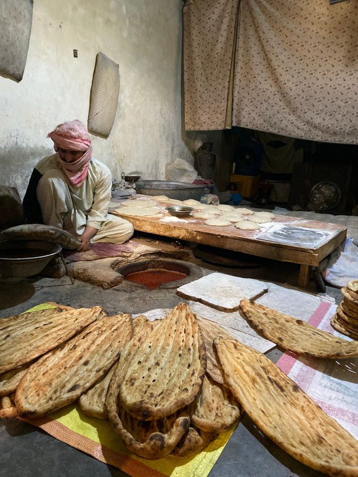 A person wearing a pink headscarf and light-colored clothing is seated near a cylindrical oven, possibly working. Several pieces of baked flatbread, some long and others rounded, are arranged nearby o…read more