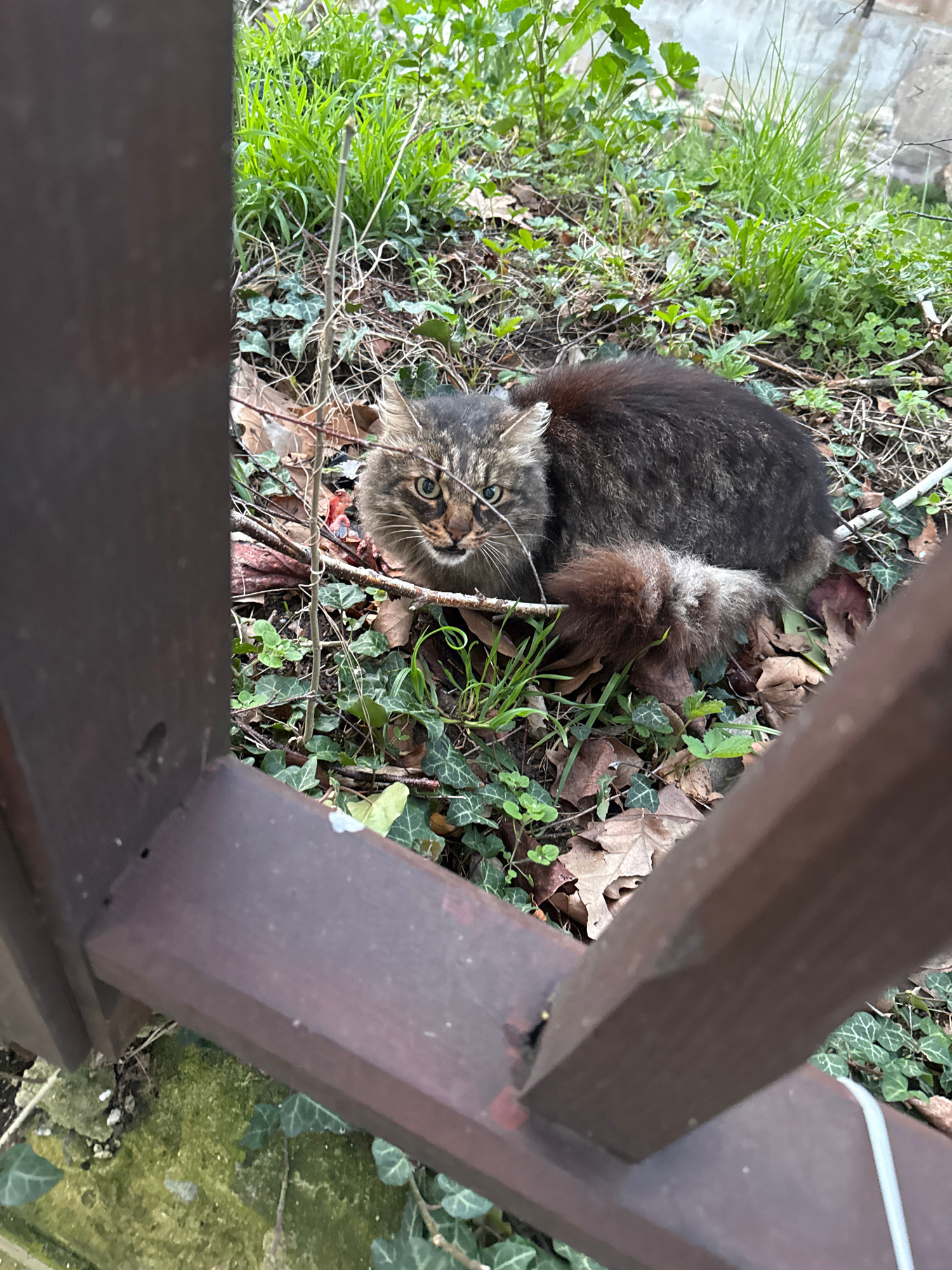 A medium-sized, tabby cat is lying in a patch of green grass, ivy, and dry leaves near a dark brown wooden fence. The cat is looking up at the viewer. The location is Sozopol, Bulgaria.