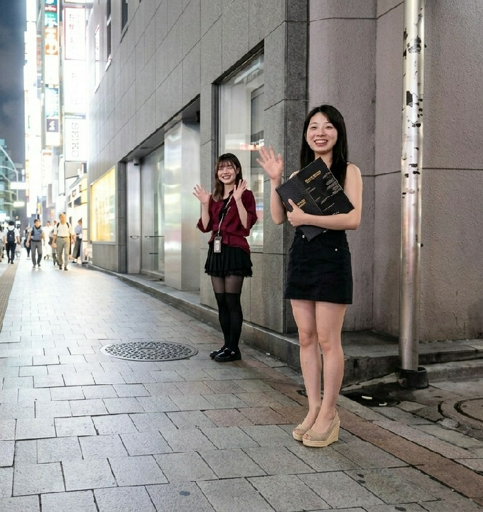 The image displays an urban street scene at night in Shibuya, Japan. Two young East Asian women are positioned in the foreground, smiling and waving towards the viewer. The woman on the right has long…read more