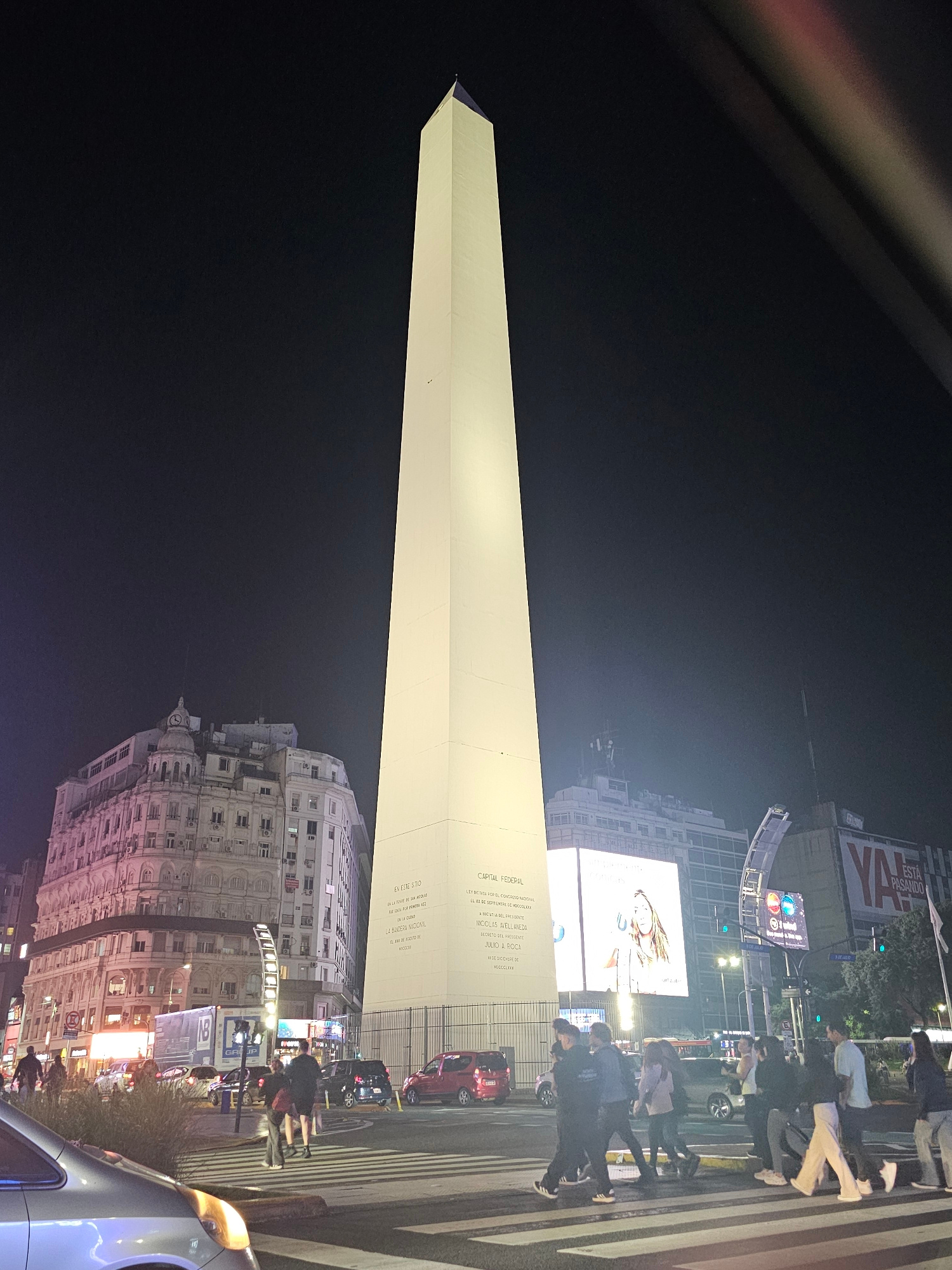 The image shows the Obelisco de Buenos Aires at night. The Obelisco is a white monument located in the Plaza de la República in Buenos Aires, Argentina. It is a popular tourist destination. In the for…read more