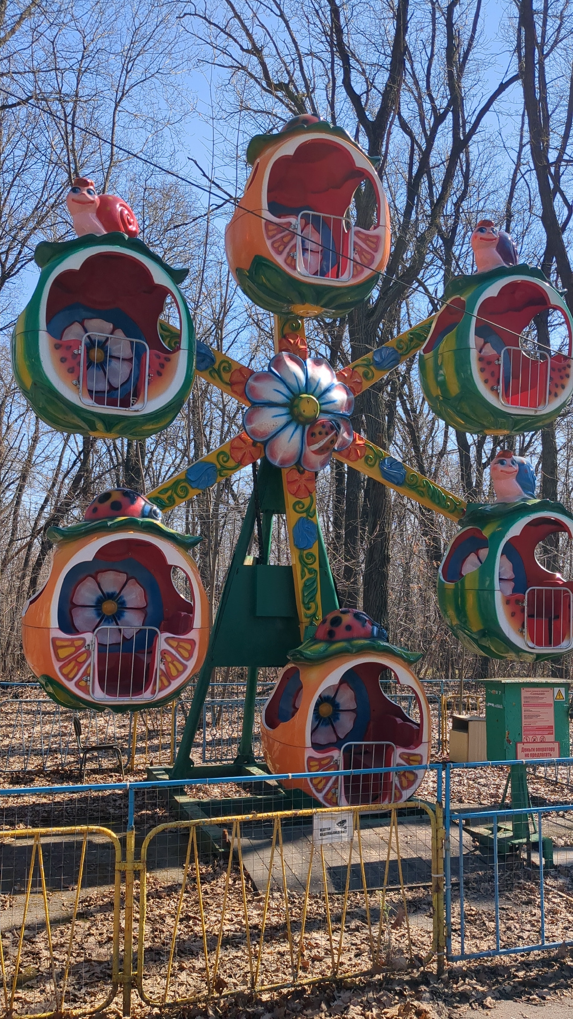 The image shows a colorful, small Ferris wheel likely located in a park or amusement area. The wheel has five fruit-shaped carriages, each with a cartoonish animal or insect figure attached (snails, b…read more
