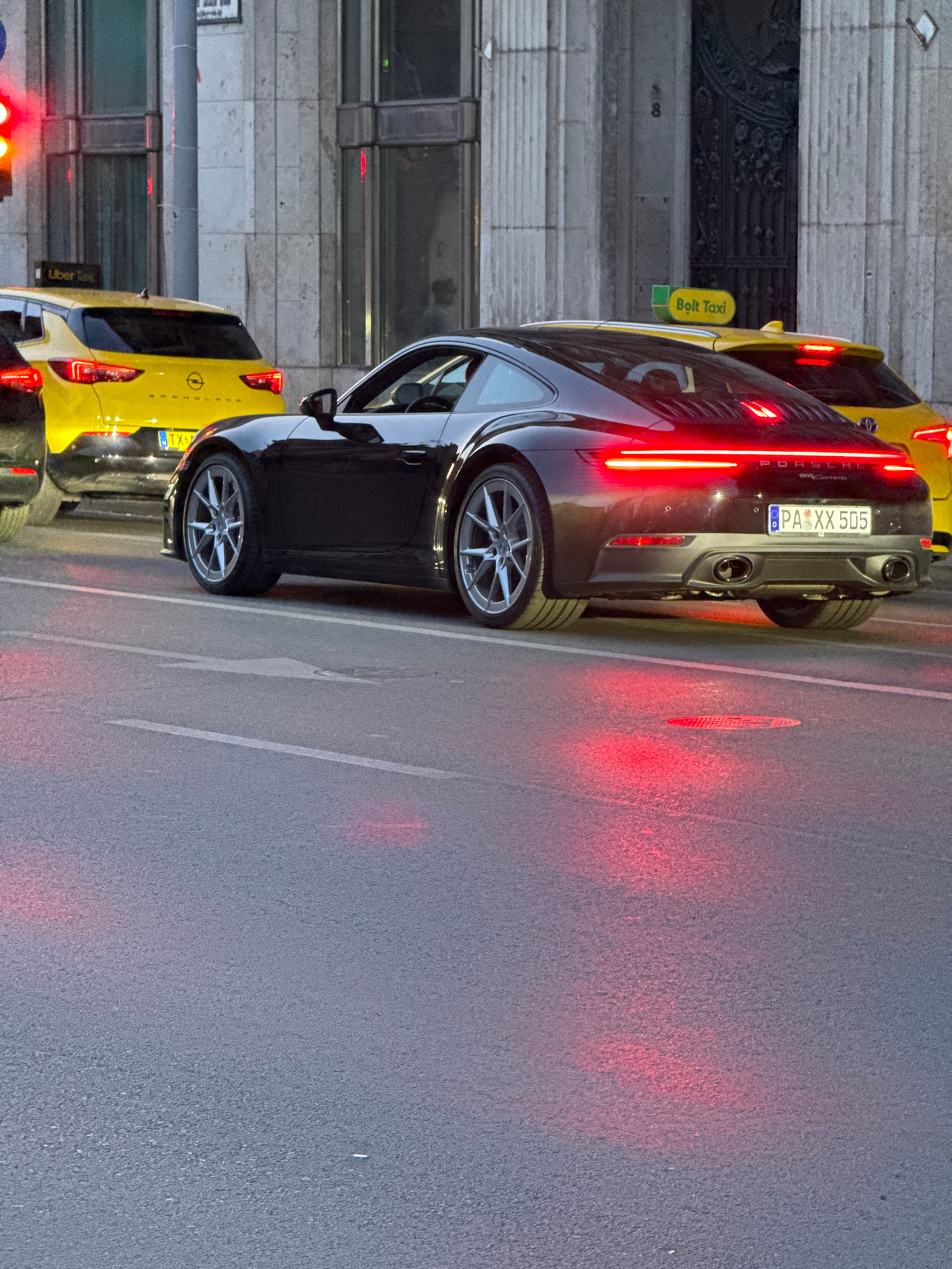 A Porsche with license plate "PA XX 505" is parked on the side of the street in Budapest, Hungary. A yellow Opel taxi is parked next to it. The street is lit with red lights.