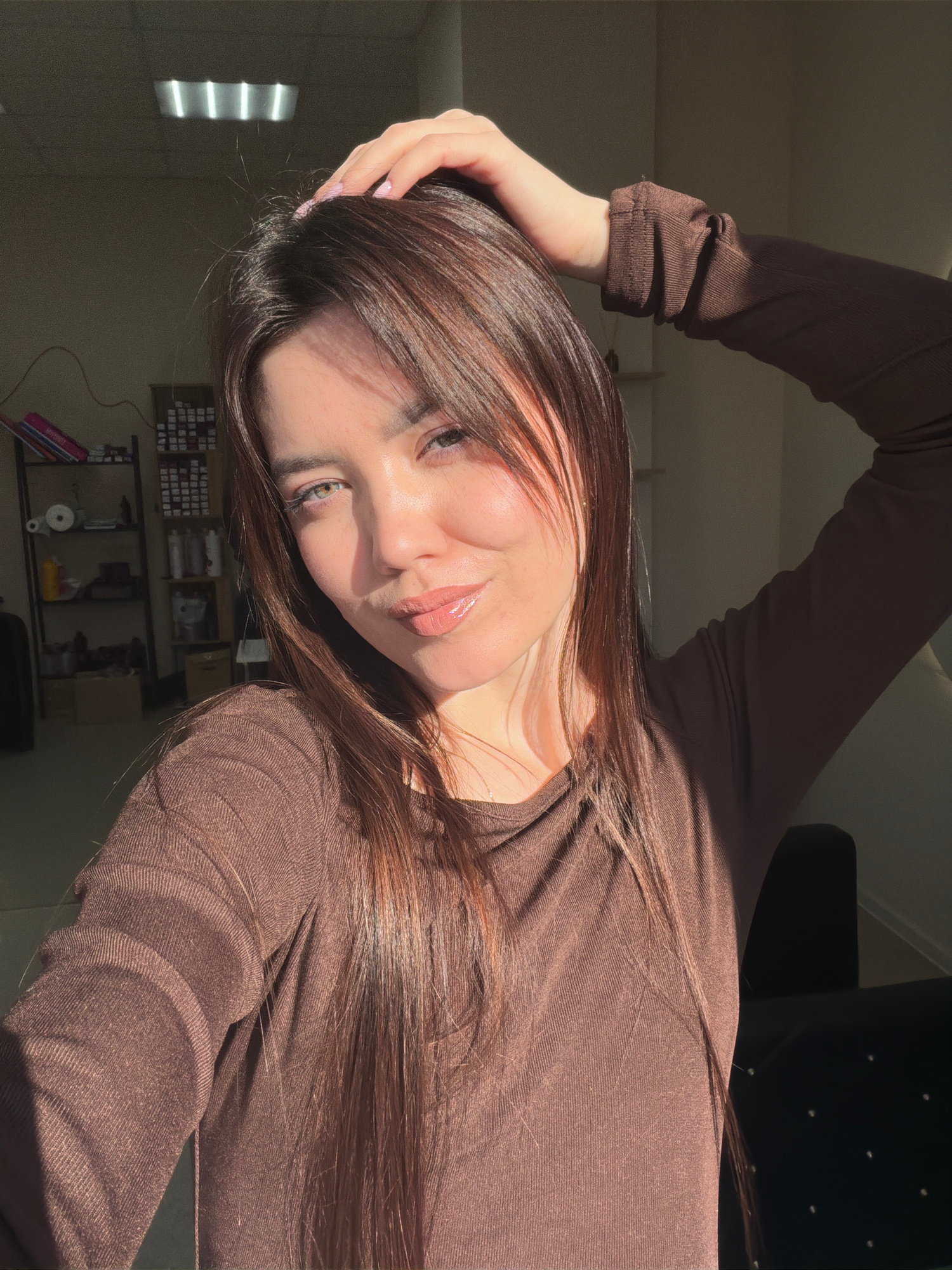 A young woman with long, brown hair and light skin is posing for a selfie in what appears to be an indoor environment. She is wearing a brown long-sleeved shirt. Her right hand is positioned above her…read more