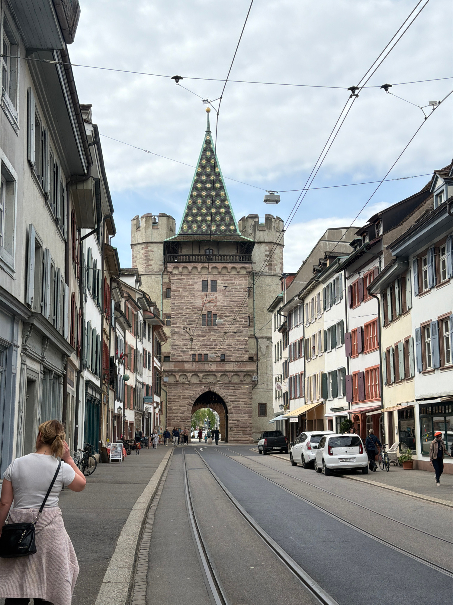 The image displays a bustling historic street in Basel, Switzerland, on an overcast day. The perspective looks down the street towards a prominent, ancient-looking gate tower constructed from rough-he…read more
