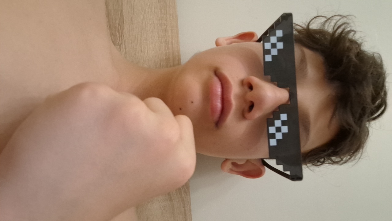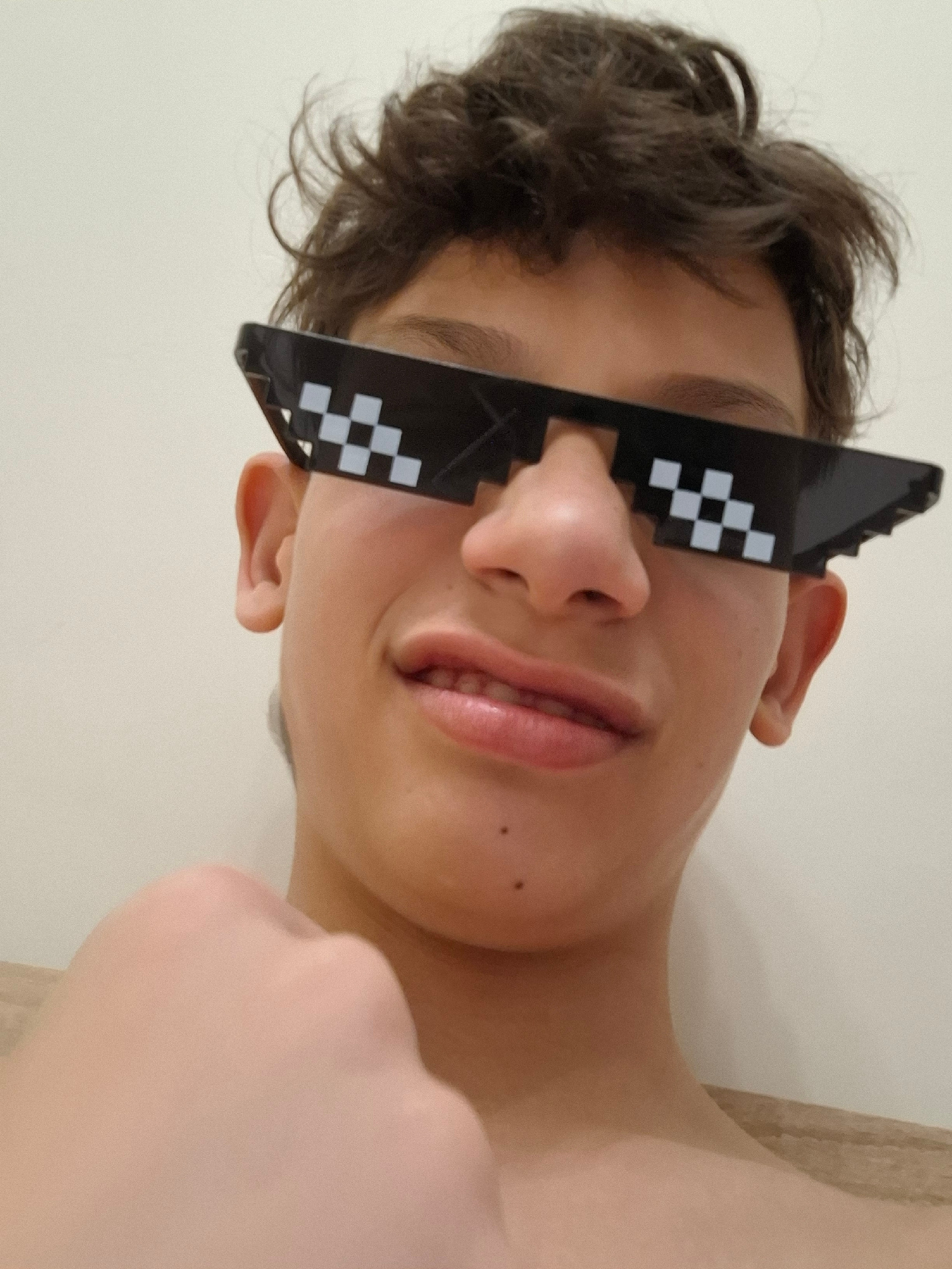 A person with brown hair and pixelated black sunglasses is lying on their back. The person's face, neck, and chest are visible. The background is a plain white or light-colored surface. The image prov…read more