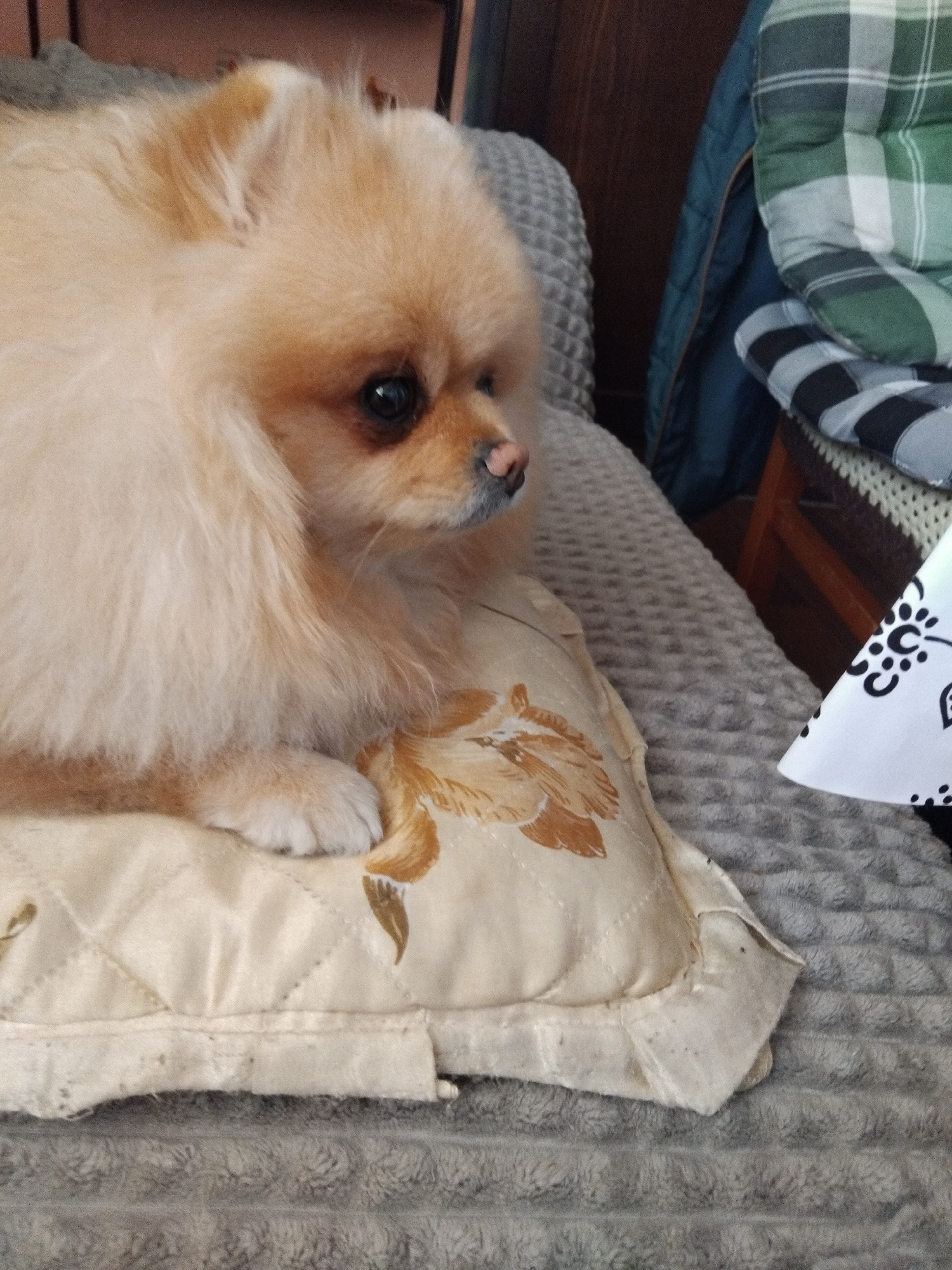 A light-brown Pomeranian dog rests on a quilted beige pillow with a floral design, which lies on a textured gray surface. The dog is facing the camera with one eye visible. Above and to the left, a wo…read more