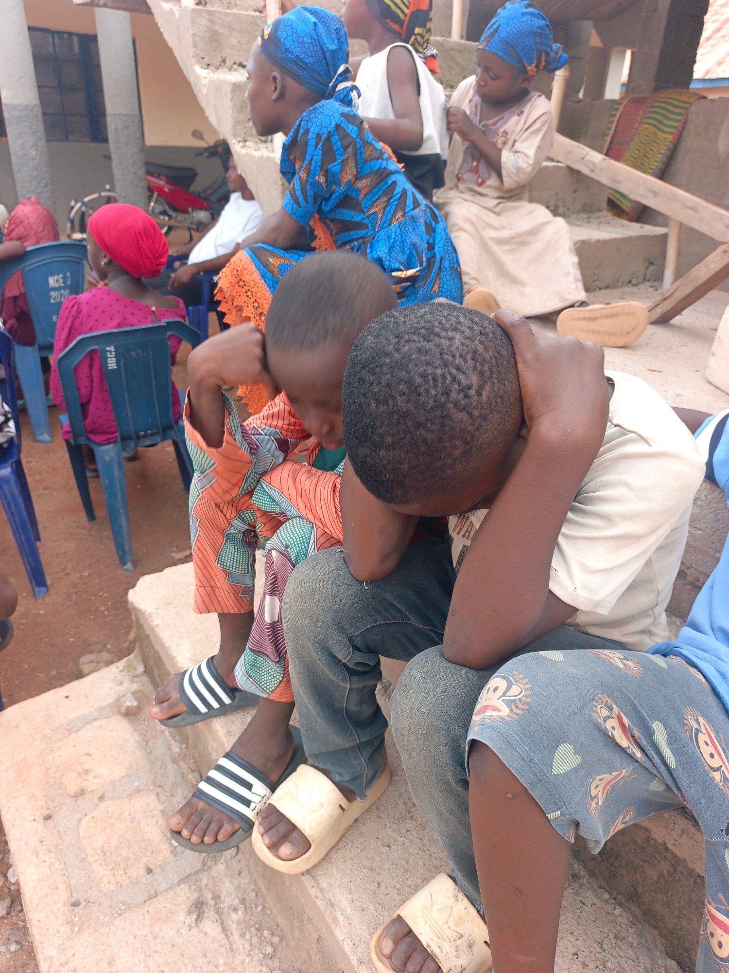 The image captures a gathering of people, primarily children, in Akwanga, Nigeria. In the immediate foreground, two boys are seated on concrete steps. One boy on the left, wearing patterned orange and…read more