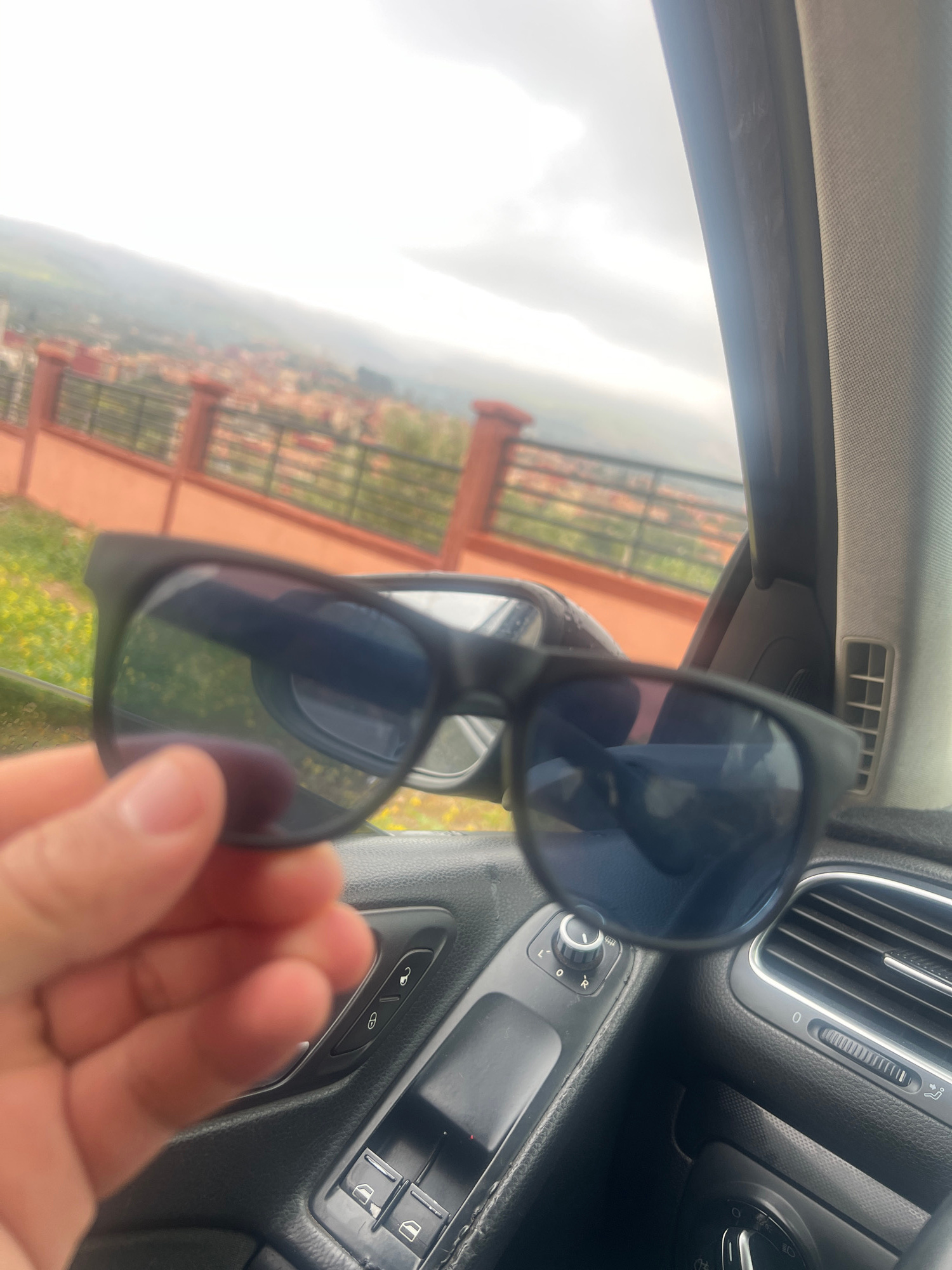 A pair of black-framed sunglasses are held up inside a car, partially obscuring a view of Ouaouizert, Morocco. The car's dashboard and door panel are visible, with controls for air vents, mirrors, and…read more