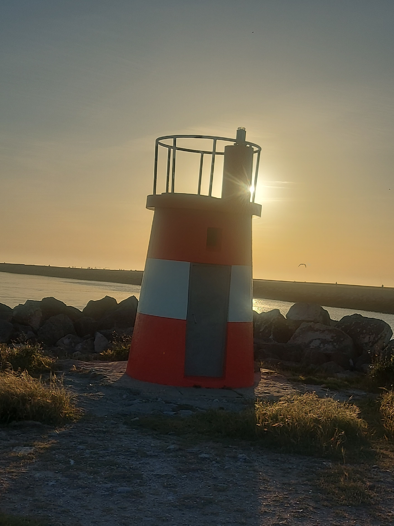 A horizontal view depicts a small, red-and-white striped lighthouse at sunset in Figueira da Foz, Portugal. The sun shines directly behind the lighthouse, creating a starburst effect and silhouetting…read more